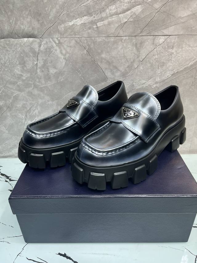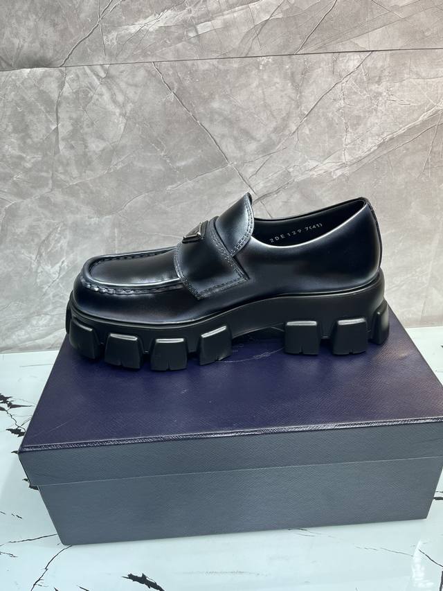 冲量价: 升级版新款prada普拉达三角形珐琅logo标,喷绘双色圆头胆位乐福得比鞋,采用原版一比一开发,大底一比一私家开模,面料采用进口开边珠,内里牛皮,垫脚牛皮,底高5Cm,大底原版橡胶发泡底,码数39-46