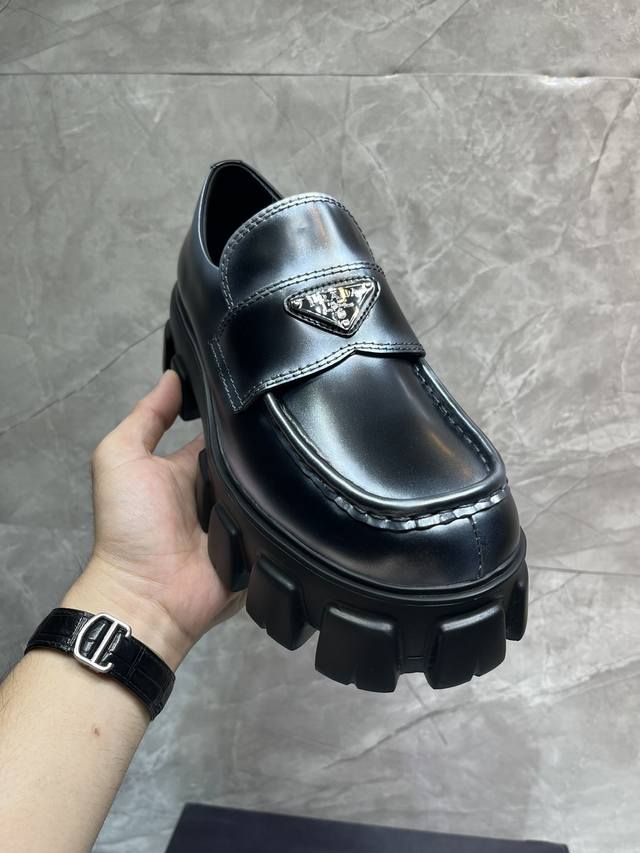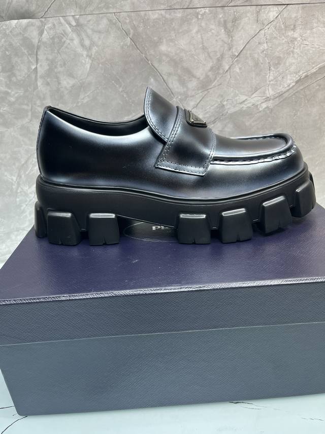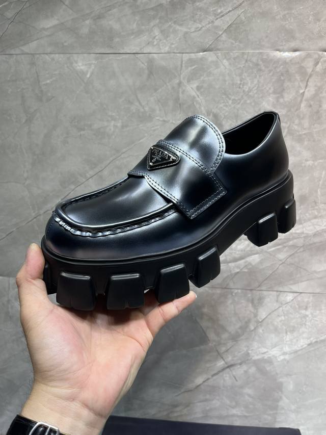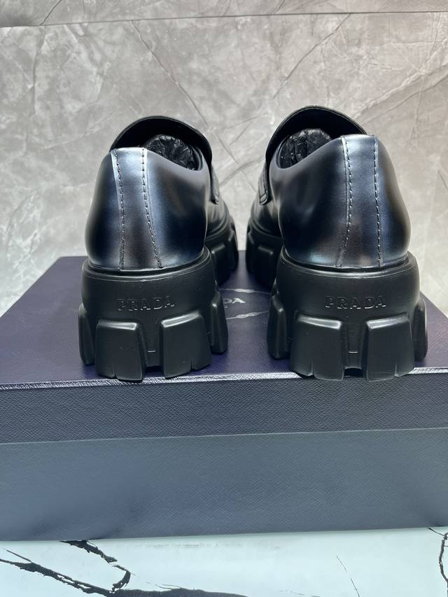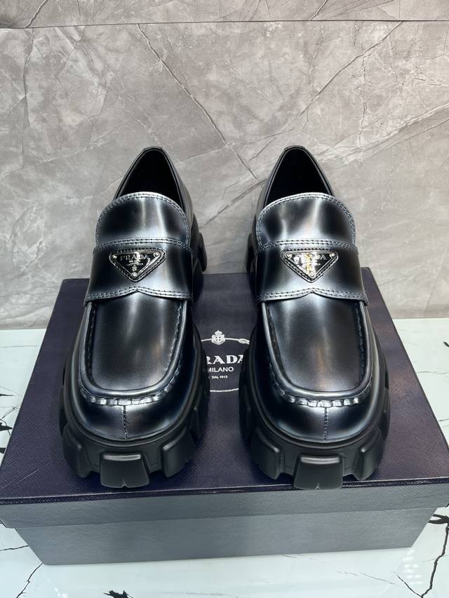/ 冲量价: 升级版新款prada普拉达三角形珐琅logo标,喷绘双色圆头胆位乐福得比鞋,采用原版一比一开发,大底一比一私家开模,面料采用进口开边珠,内里牛皮,垫脚