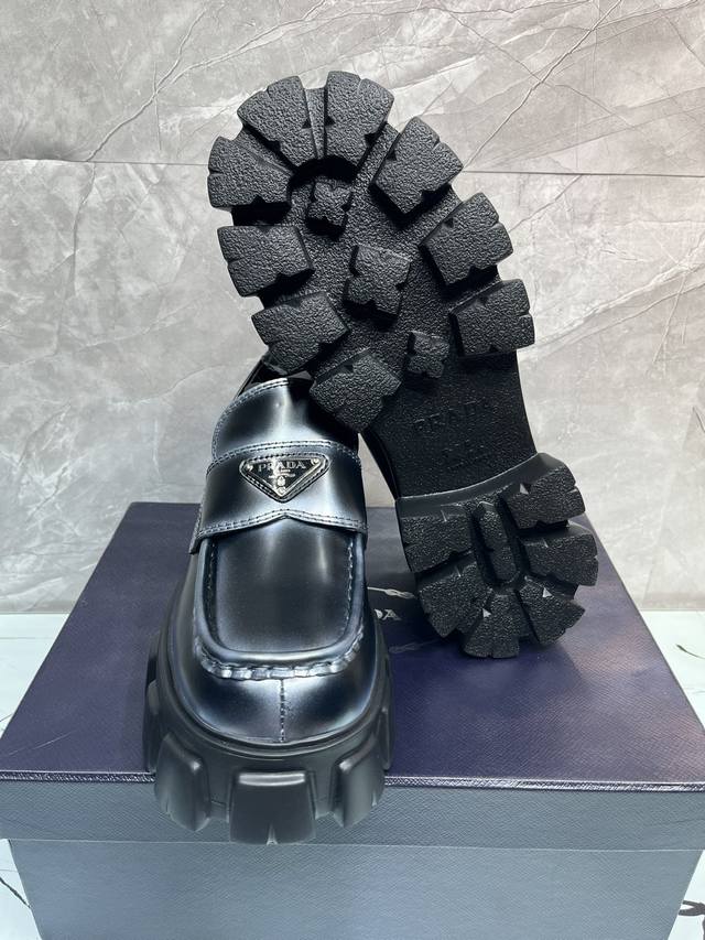 冲量价: 升级版新款prada普拉达三角形珐琅logo标,喷绘双色圆头胆位乐福得比鞋,采用原版一比一开发,大底一比一私家开模,面料采用进口开边珠,内里牛皮,垫脚