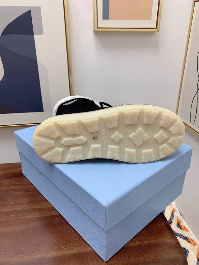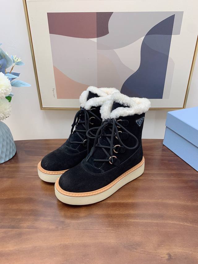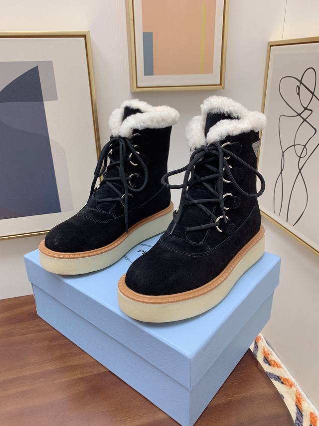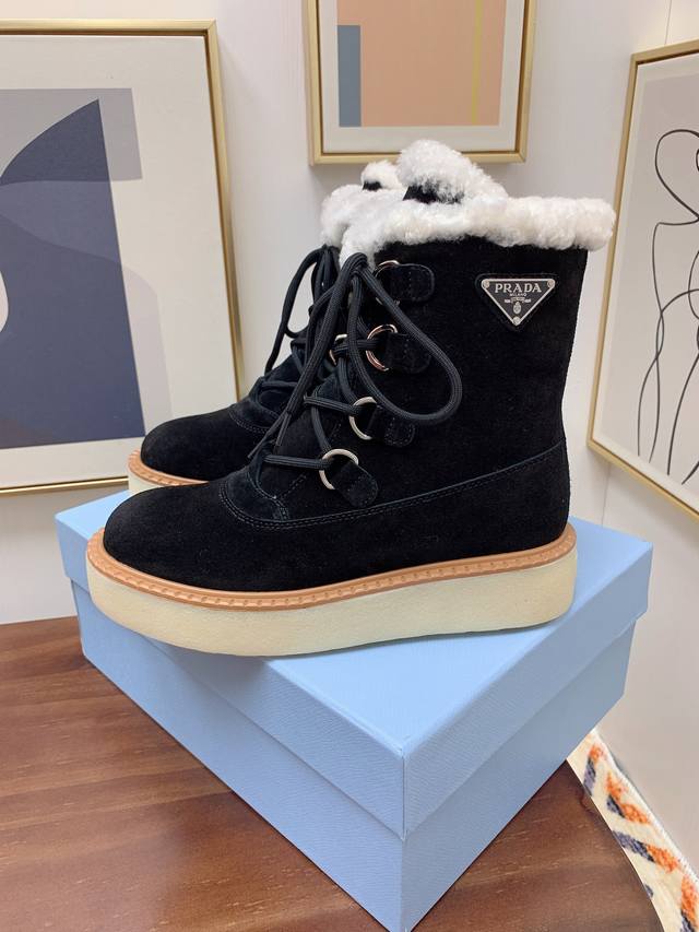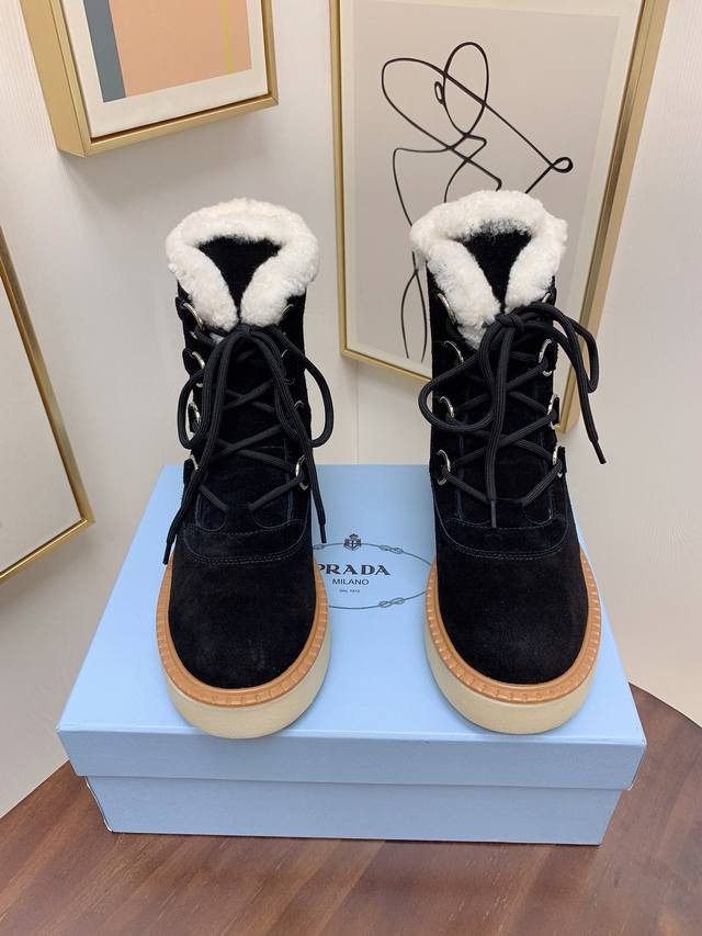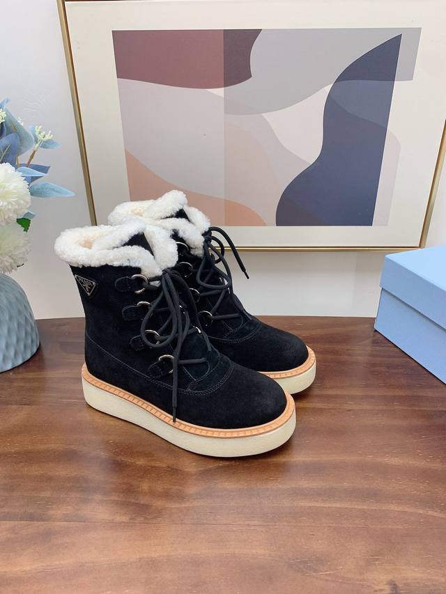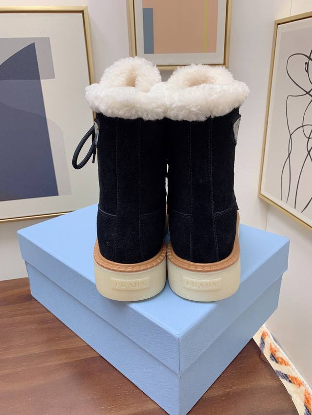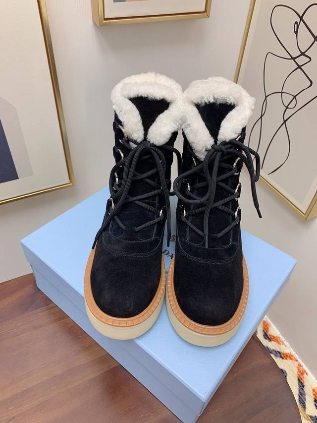 出厂价 Prada*普拉达2024Ss秋冬新款绑带雪地靴真羊毛短靴