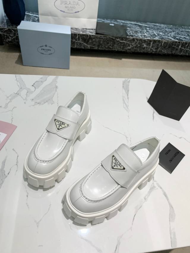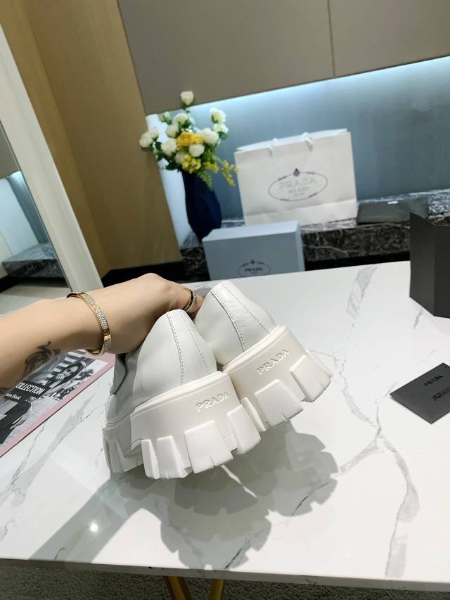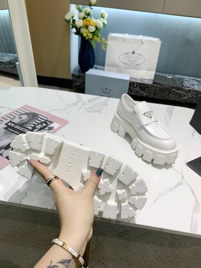 普拉达 春秋新款黑色开边朱漆皮厚底休闲小皮鞋,刘雯众多网红上脚,prad这款松糕厚底鞋今年非常爆,穿上 增高 休闲两不失误,清爽的表现足以表达对鞋子的个个细节的把控,
