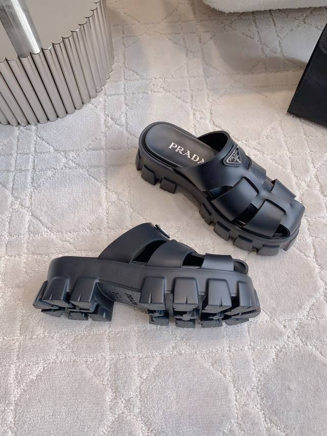 Prad*新款三角标厚底凉拖鞋 经典Logo装饰尽显精致 厚底设计拉长腿部线条 脚感超级柔软舒适