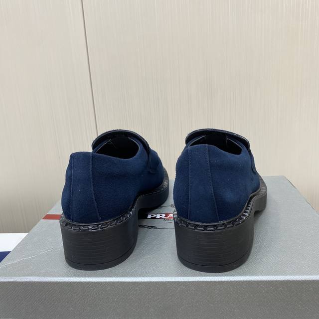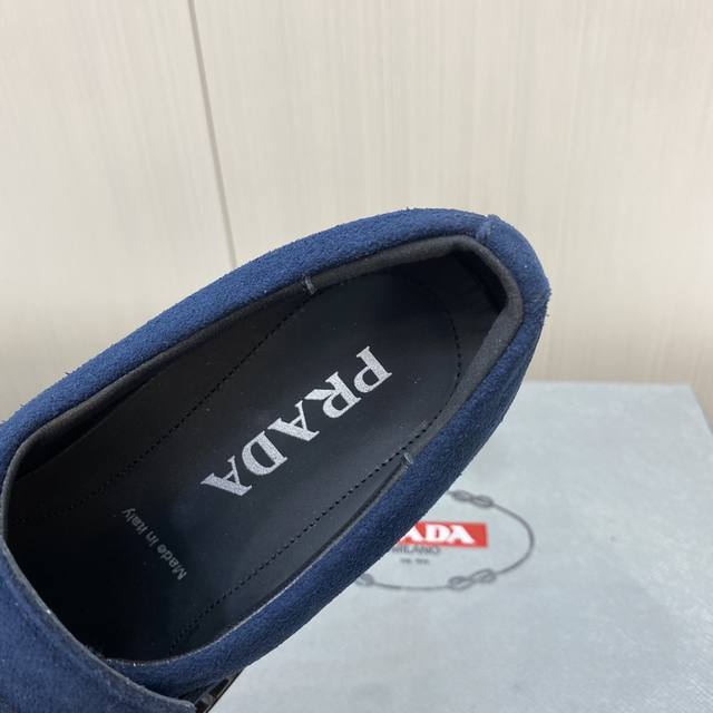 出厂价Prada 早春新款高品质情侣款乐福鞋,上脚舒适、超级百搭面料:A级进口高丝光牛反绒内里:柔软丝绸羊皮垫脚:丝稠牛皮垫脚码数:35-45配专柜包装出货