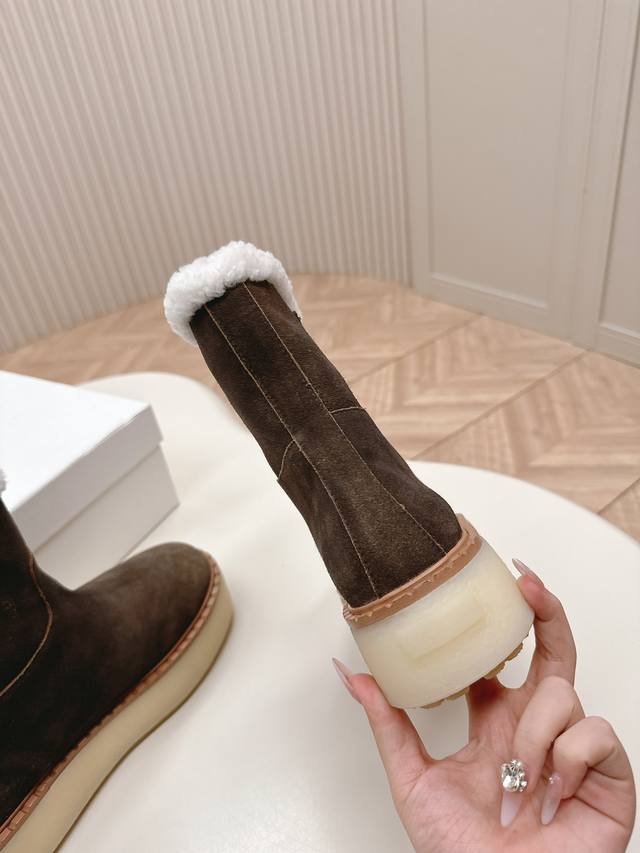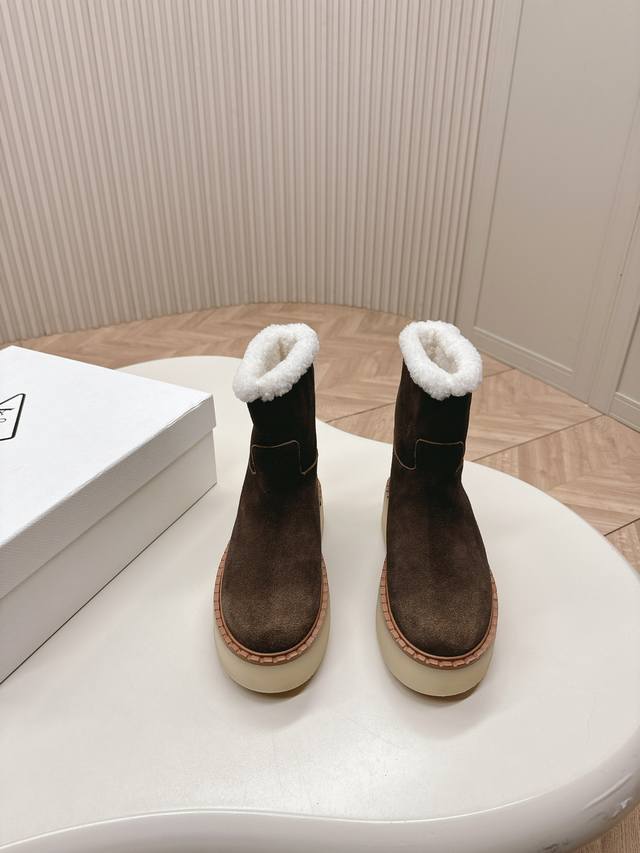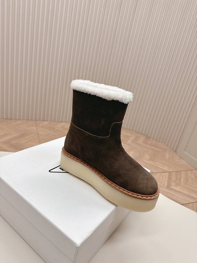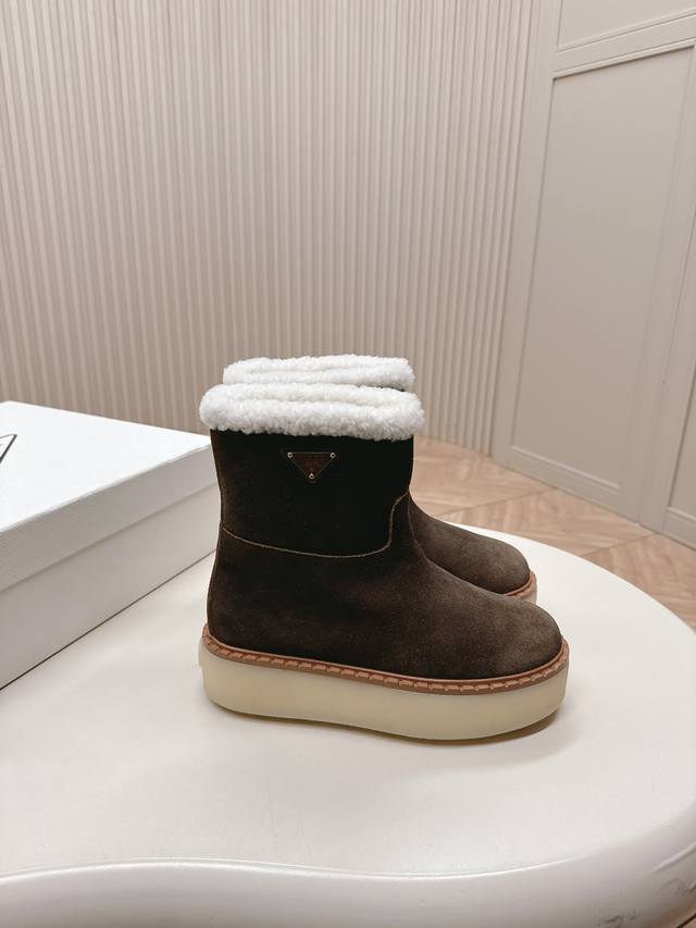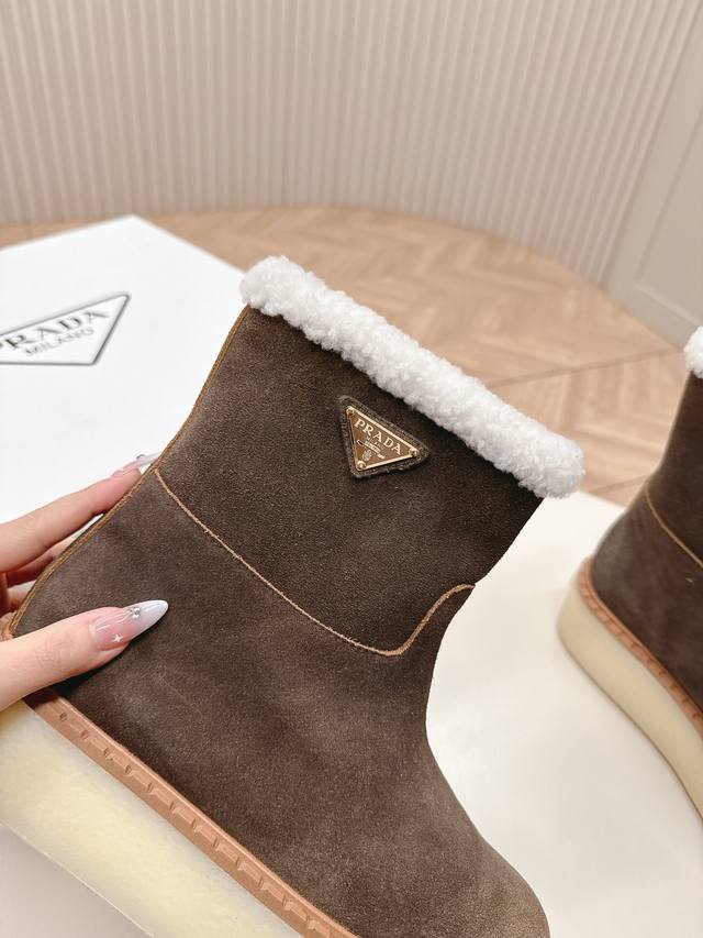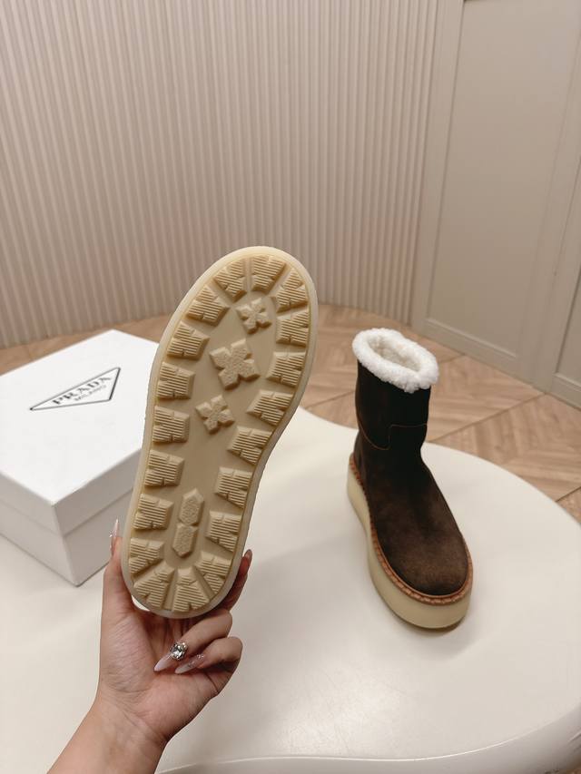 出 市面最高版本 Prada 普拉达24秋冬新款△三角标羊毛鞋,厚底靴 雪地靴 双色擦色牛绒真羊羔毛 真皮沿条 双色tpu大底 材质细节可对比原版,市面普通版本