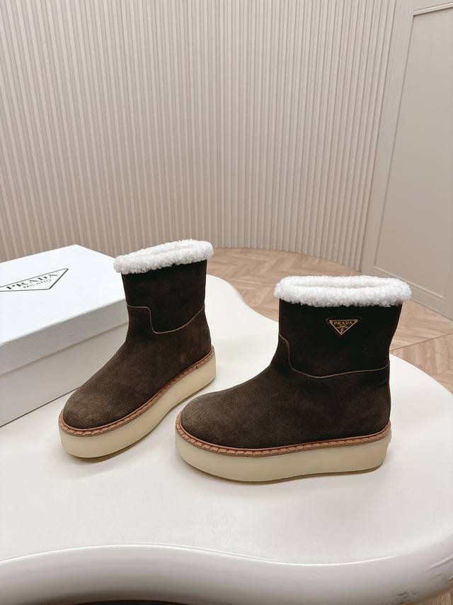 出 市面最高版本 Prada 普拉达24秋冬新款△三角标羊毛鞋,厚底靴 雪地靴 双色擦色牛绒真羊羔毛 真皮沿条 双色tpu大底 材质细节可对比原版,市面普通版本区分!Size:35-39 40 41定做不退换