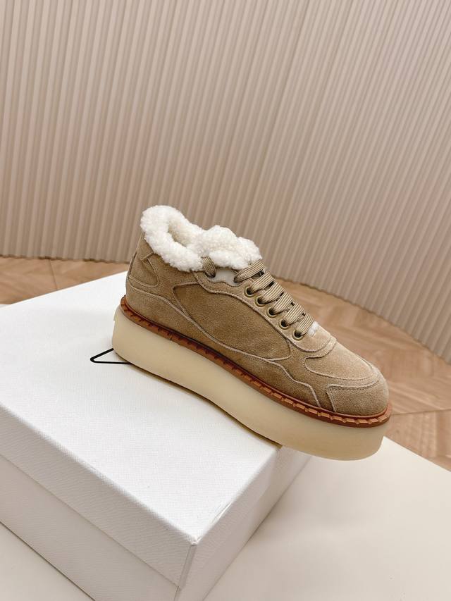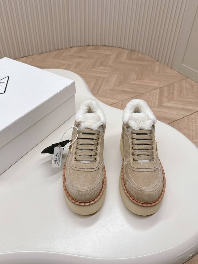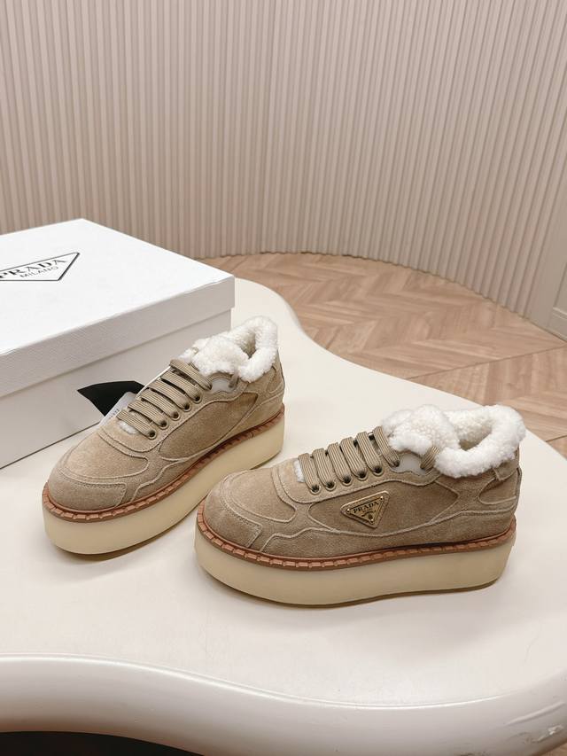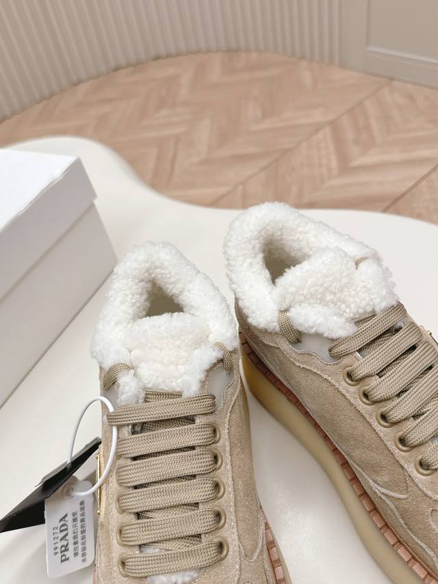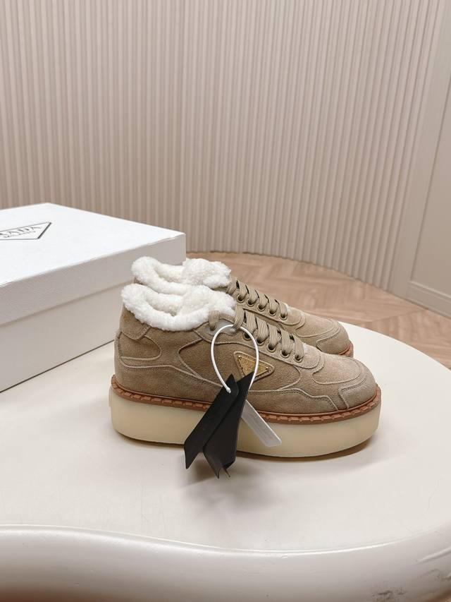 出 市面最高版本 Prada 普拉达24秋冬新款△三角标羊毛高帮鞋,厚底靴 雪地靴 双色擦色牛绒真羊羔毛 真皮沿条 双色tpu大底 材质细节可对比原版,市面普通版本区分!Size:35-39 40 41定做不退换