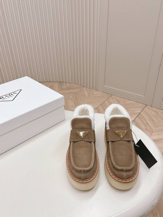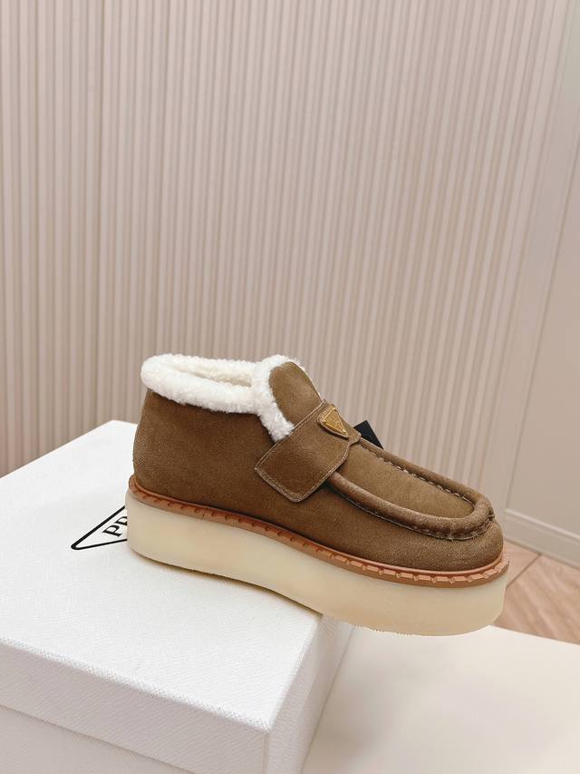 出 市面最高版本 Prada 普拉达24秋冬新款△三角标羊毛高帮鞋,厚底靴 雪地靴 双色擦色牛绒真羊羔毛 真皮沿条 双色tpu大底 材质细节可对比原版,市面普通版本区分!Size:35-39 40 41定做不退换