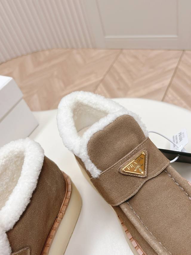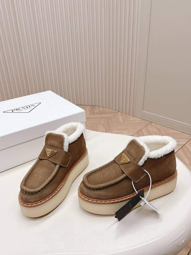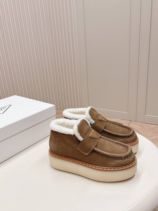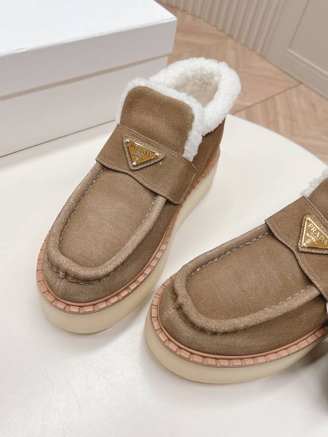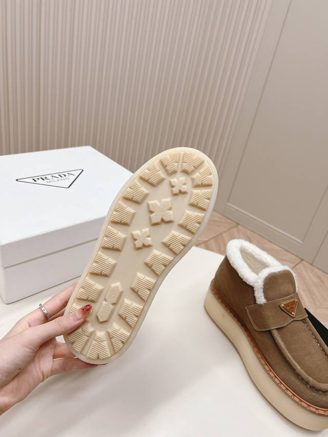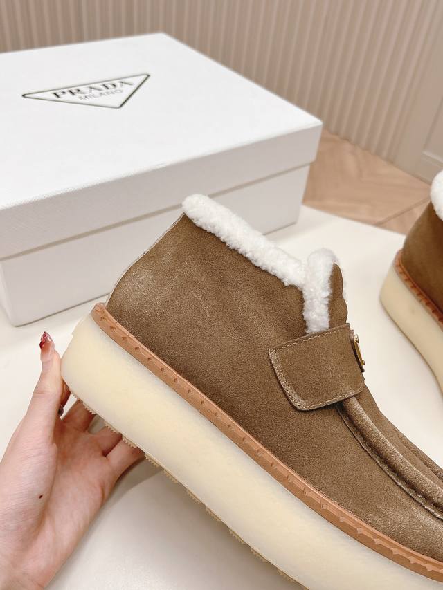 / 出 市面最高版本 Prada 普拉达24秋冬新款△三角标羊毛高帮鞋,厚底靴 雪地靴 双色擦色牛绒真羊羔毛 真皮沿条 双色tpu大底 材质细节可对比原版,市面普通