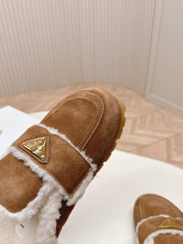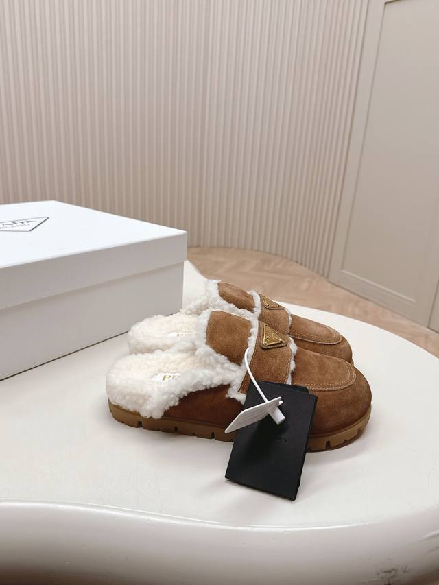 最新系列!Prada 普拉达 秋冬季新款毛拖鞋 三角扣面包包头半拖鞋 最新走秀系列 经典升级 舒适度与时髦度并存 每个颜色搭配都好看,设计搭配不同风格需求