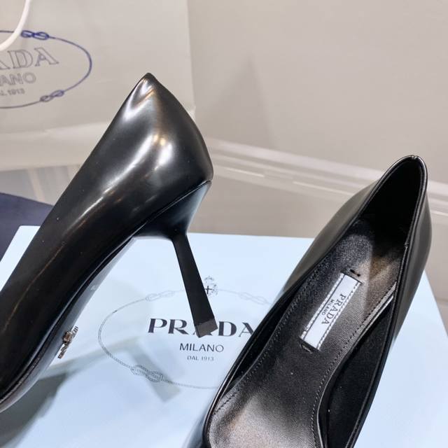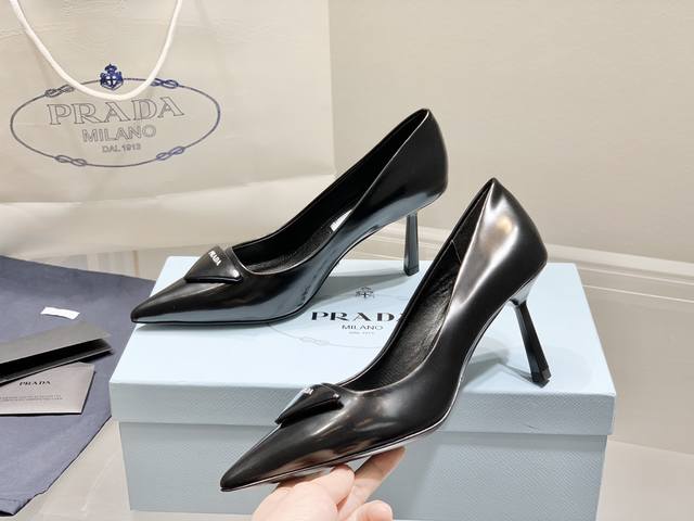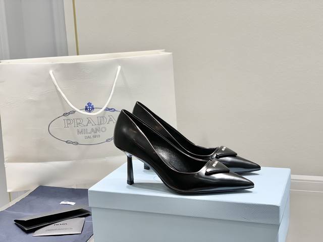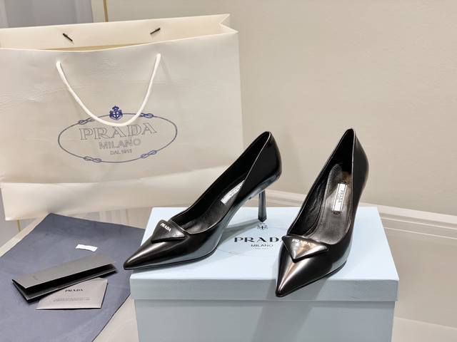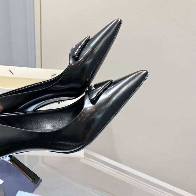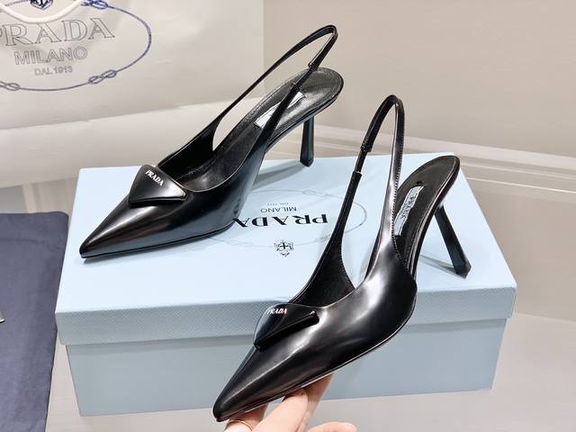 Prada普拉达 三角扣细高跟单鞋 后空凉鞋