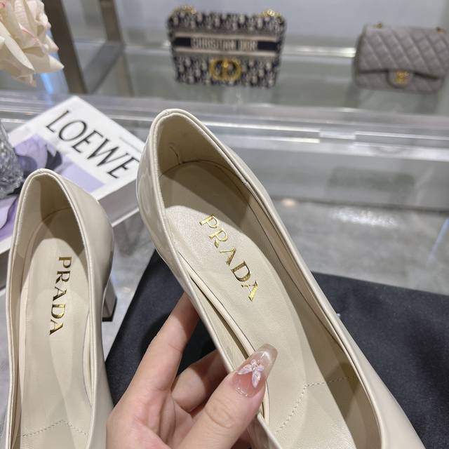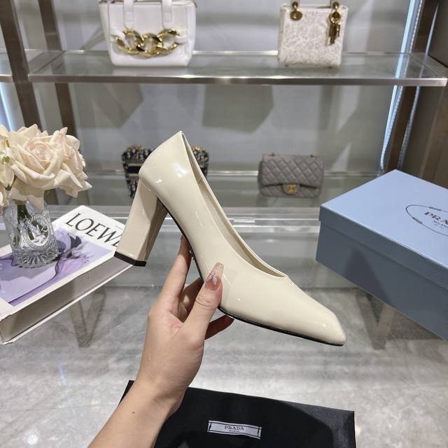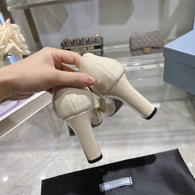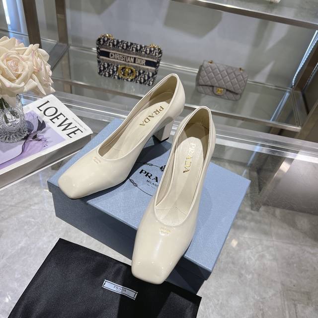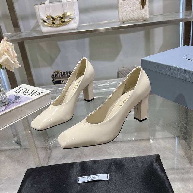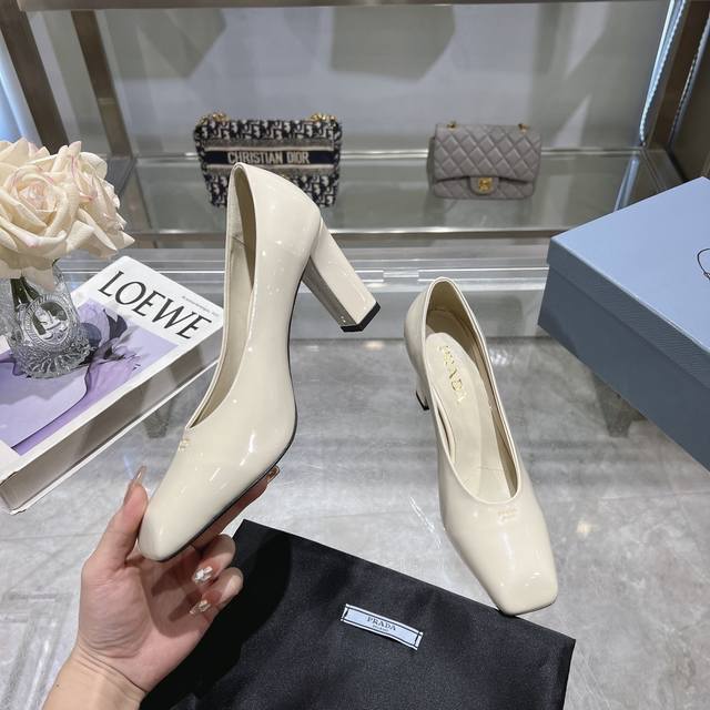 工厂价 ,25年新款上市走秀明星新品时尚潮流 Prada 普拉达 方头高跟方跟粗跟凉鞋后空单鞋。鞋面采用进口牛漆皮,内里垫脚为进口羊皮,意大利注塑真皮大底。跟高