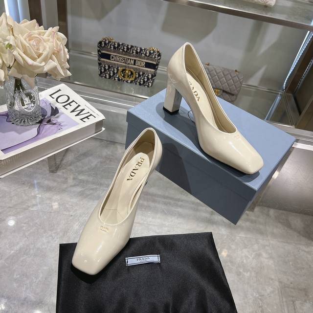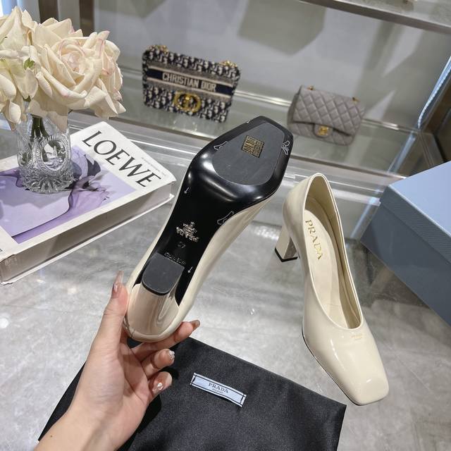 工厂价 ,25年新款上市走秀明星新品时尚潮流 Prada 普拉达 方头高跟方跟粗跟凉鞋后空单鞋。鞋面采用进口牛漆皮,内里垫脚为进口羊皮,意大利注塑真皮大底。跟高:5.5Cm、 8.3Cm。Size:35-40 41可定做,不退换