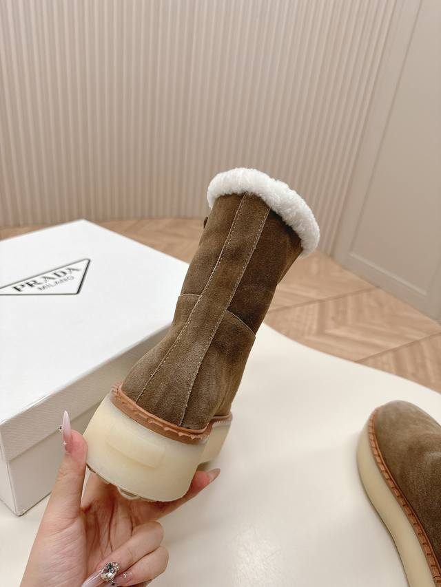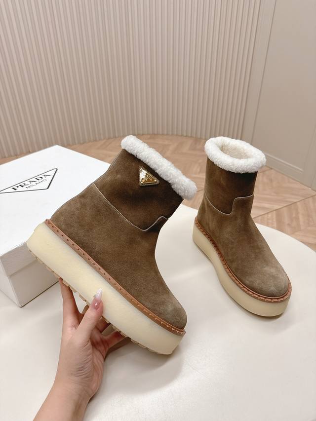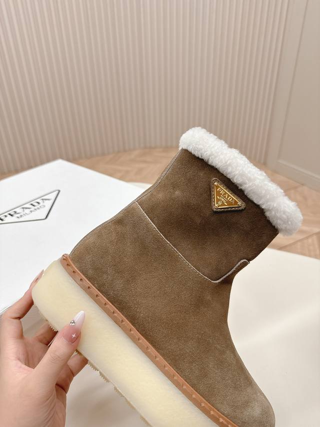 / 市面最高版本 Prada 普拉达24秋冬新款△三角标羊毛鞋,厚底靴 雪地靴 双色擦色牛绒真羊羔毛 真皮沿条 双色tpu大底 材质细节可对比原版,市面普通版本区分