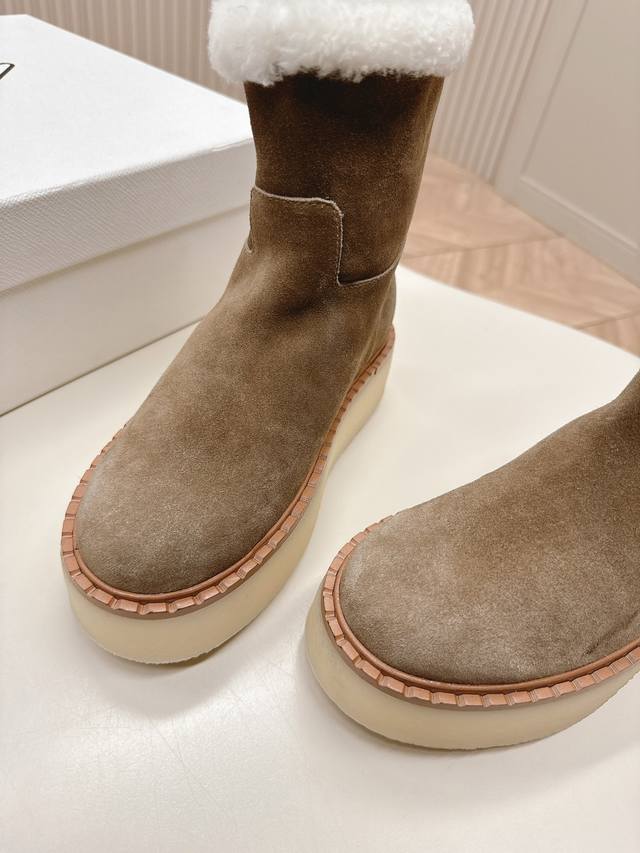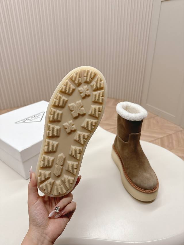 市面最高版本 Prada 普拉达24秋冬新款△三角标羊毛鞋,厚底靴 雪地靴 双色擦色牛绒真羊羔毛 真皮沿条 双色tpu大底 材质细节可对比原版,市面普通版本区分