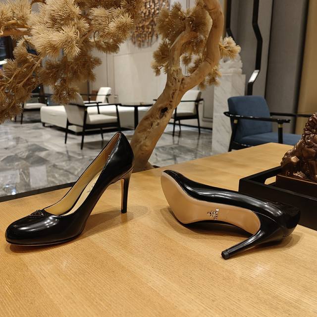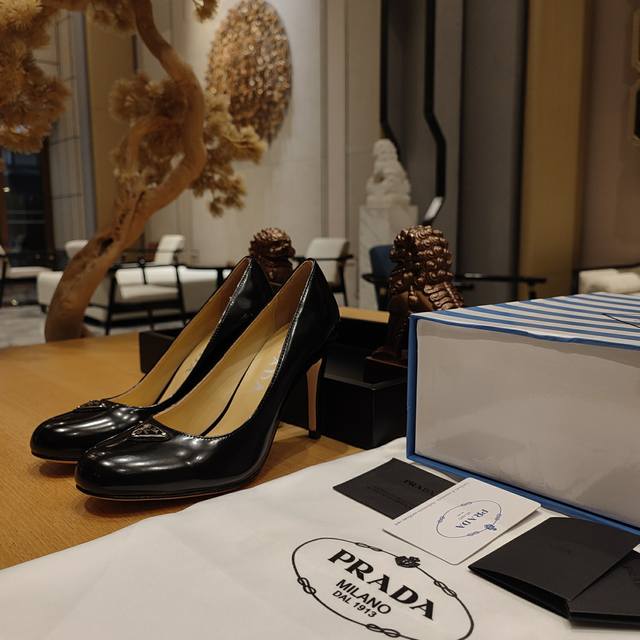 开边珠通勤系列 顶级包装配套最高版本 Prada 2024普拉达最新颖高跟圆头单鞋。品牌少有的圆头形开边珠秋季时尚高跟鞋系列。