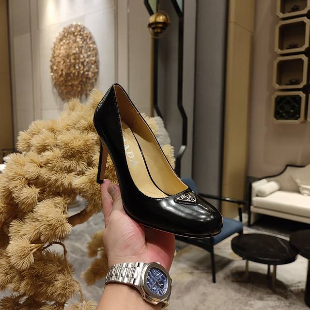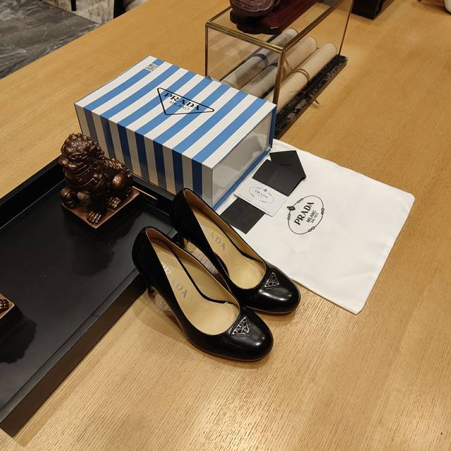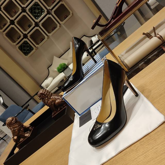 开边珠通勤系列 顶级包装配套最高版本 Prada 2024普拉达最新颖高跟圆头单鞋。品牌少有的圆头形开边珠秋季时尚高跟鞋系列。 2024S Prada秋季新款好