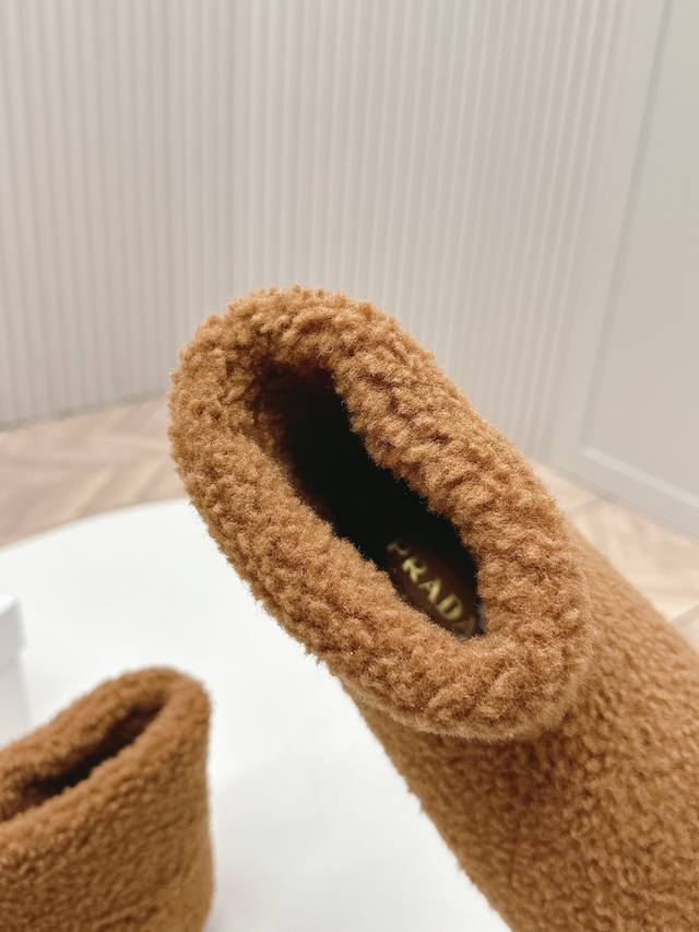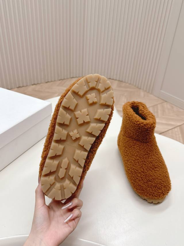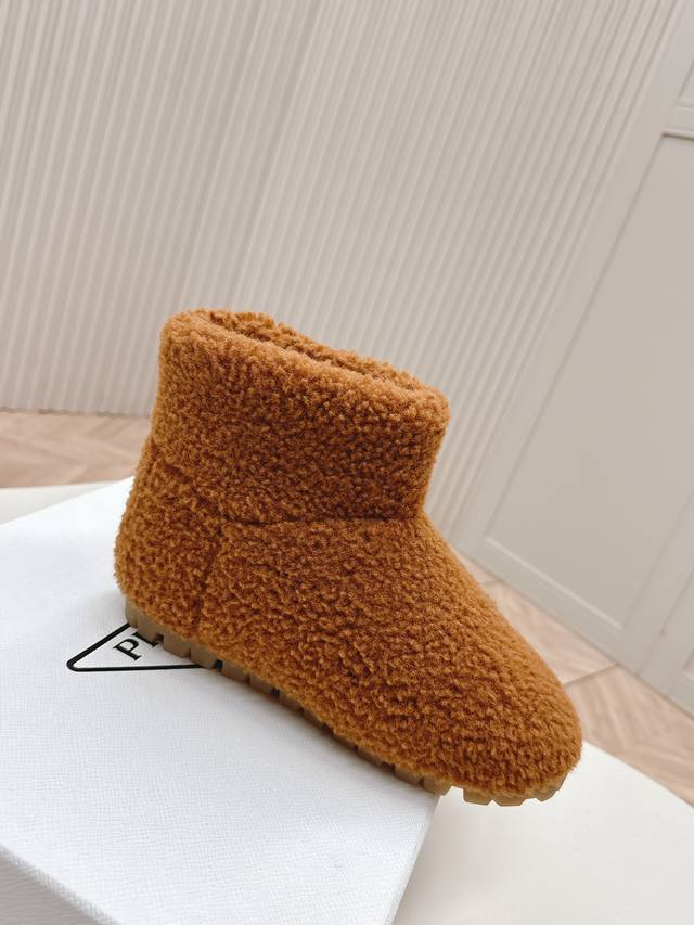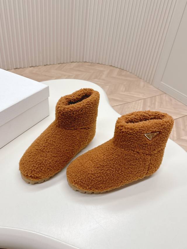 普拉达 prada24秋冬毛毛短靴 雪地靴.经典三角扣 舒适 萌萌哒 可爱 时尚 高雅 百搭 ,羊毛舒适柔软,唤醒秋冬暖意。让您从早到晚舒适踱步。可以轻松驾驭四