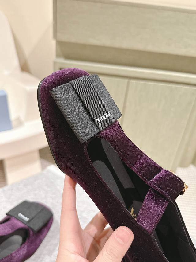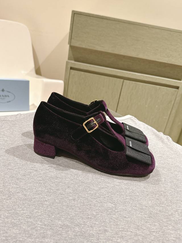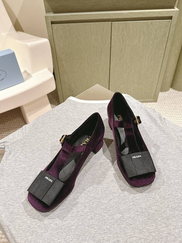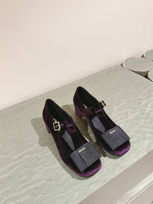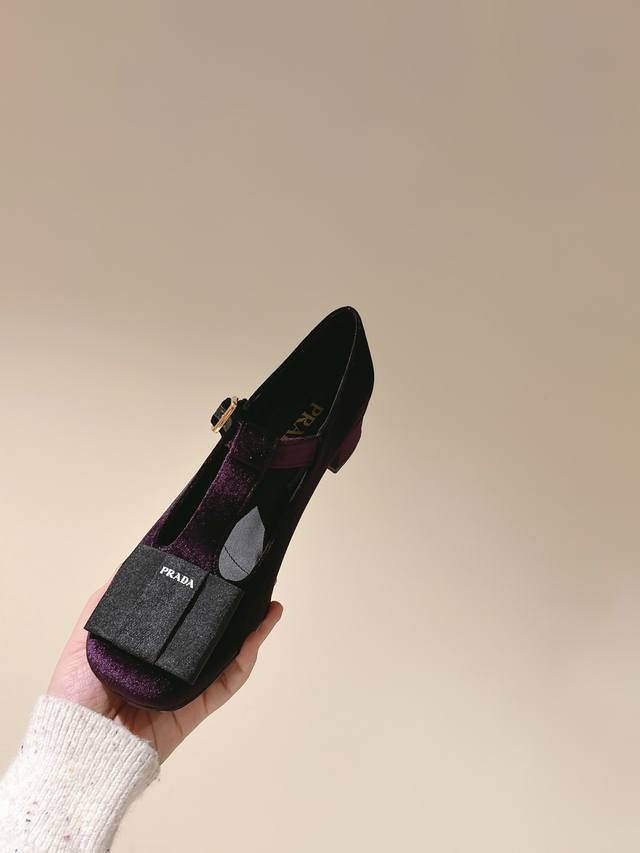 普拉达25 S早春新品 顶级版本,prad*新款三角标丝绒蝴蝶结玛丽珍单鞋 复古又时髦 粗跟设计超好穿 简约大气 原版购入1:1打造 细节感拉满。新年新气象!上