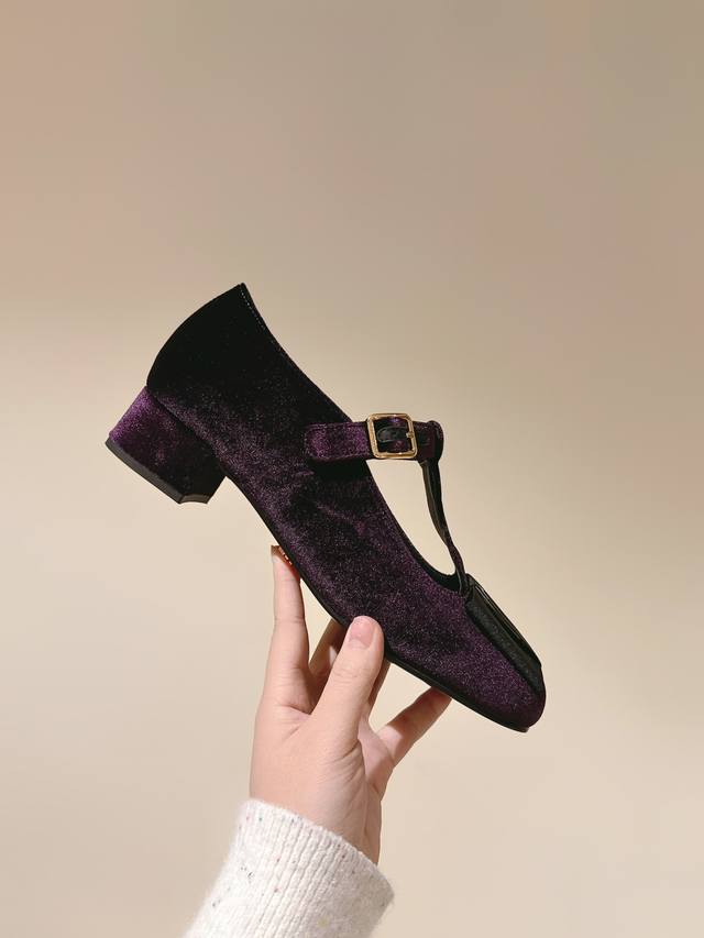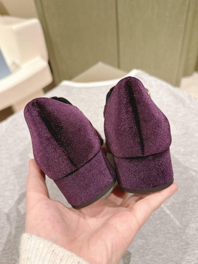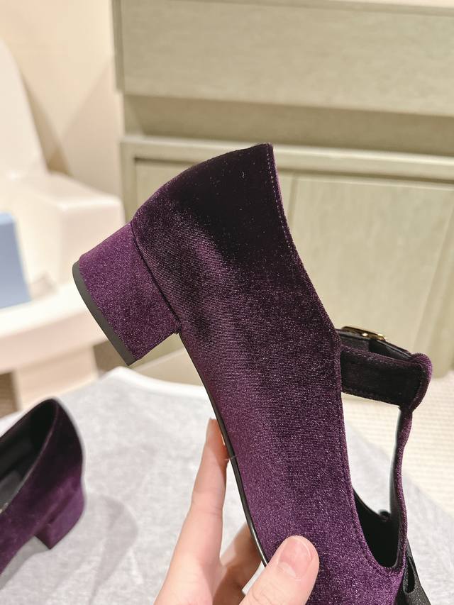 普拉达25 S早春新品 顶级版本,prad*新款三角标丝绒蝴蝶结玛丽珍单鞋 复古又时髦 粗跟设计超好穿 简约大气 原版购入1:1打造 细节感拉满。新年新气象!上脚百搭舒适!
