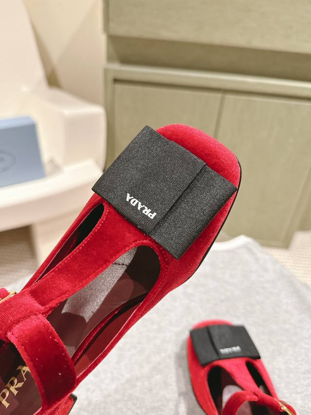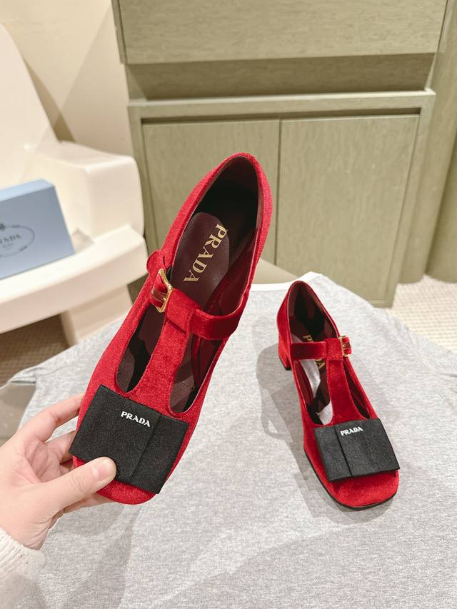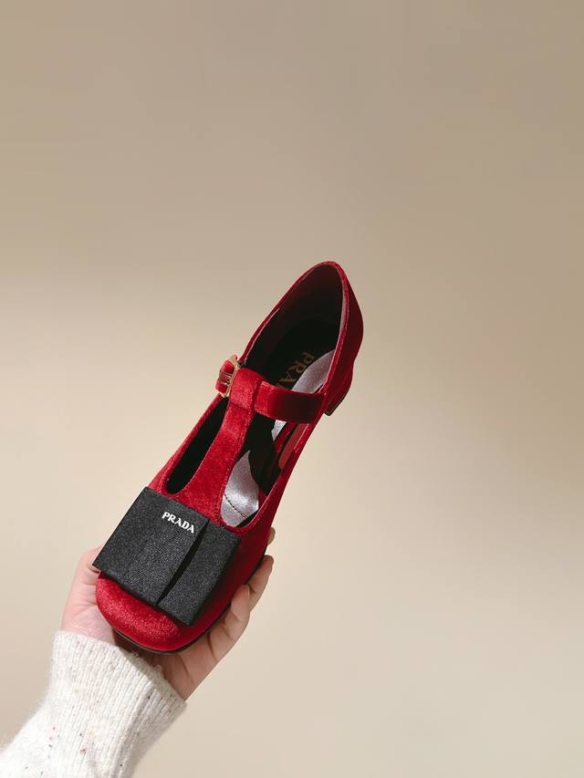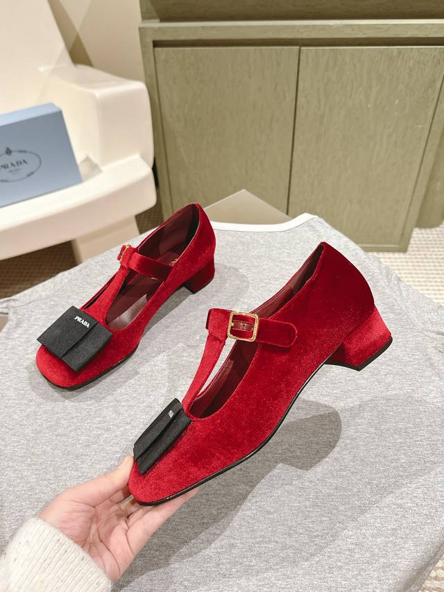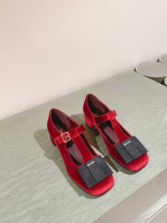 普拉达25 S早春新品 顶级版本,Prad*新款三角标丝绒蝴蝶结玛丽珍单鞋 复古又时髦 粗跟设计超好穿 简约大气 原版购入1:1打造 细节感拉满 新年新气象!上