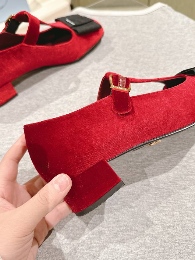 普拉达25 S早春新品 顶级版本,Prad*新款三角标丝绒蝴蝶结玛丽珍单鞋 复古又时髦 粗跟设计超好穿 简约大气 原版购入1:1打造 细节感拉满 新年新气象!上脚百搭舒适!