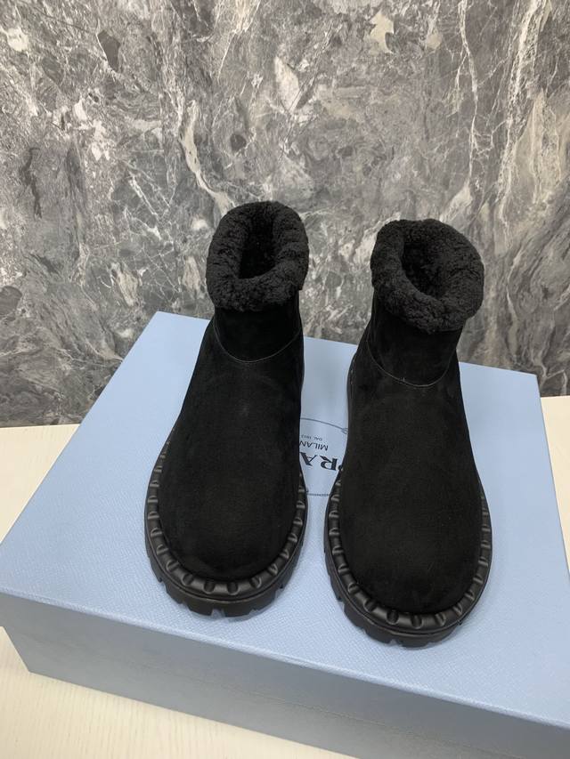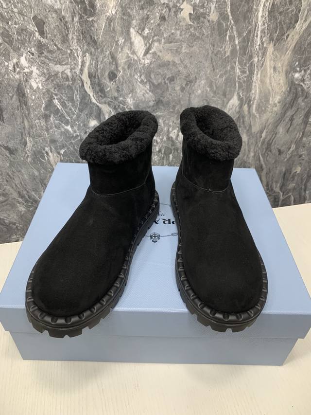 普拉达prada 王炸款 雪地靴 滑雪靴 胖墩墩的 好看可爱到爆炸 →_→来自 prada限定系列,别具一格。闪亮尼龙 Oblique 鞋面搭配交叉系带,打造理想的贴合度。靴筒科技面料,短筒版型,在都市或山地均可穿着,显小腿细 又增高 保暖又凹造型