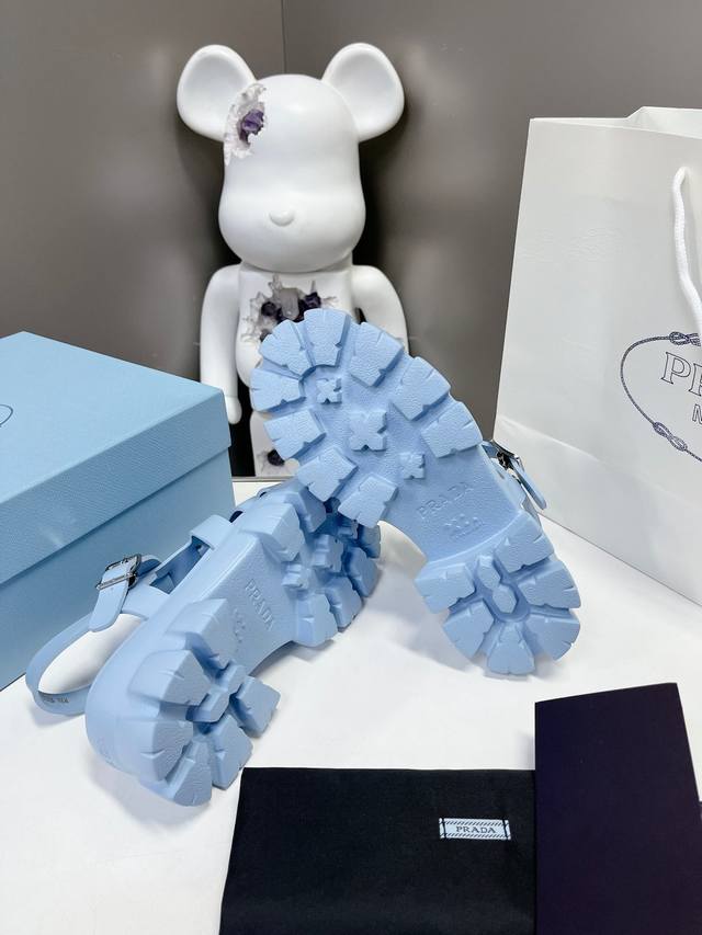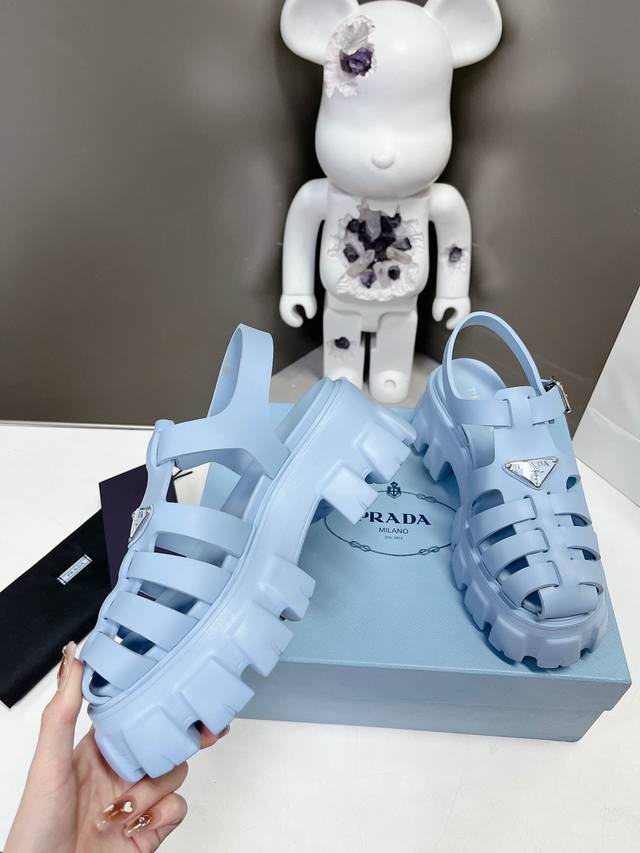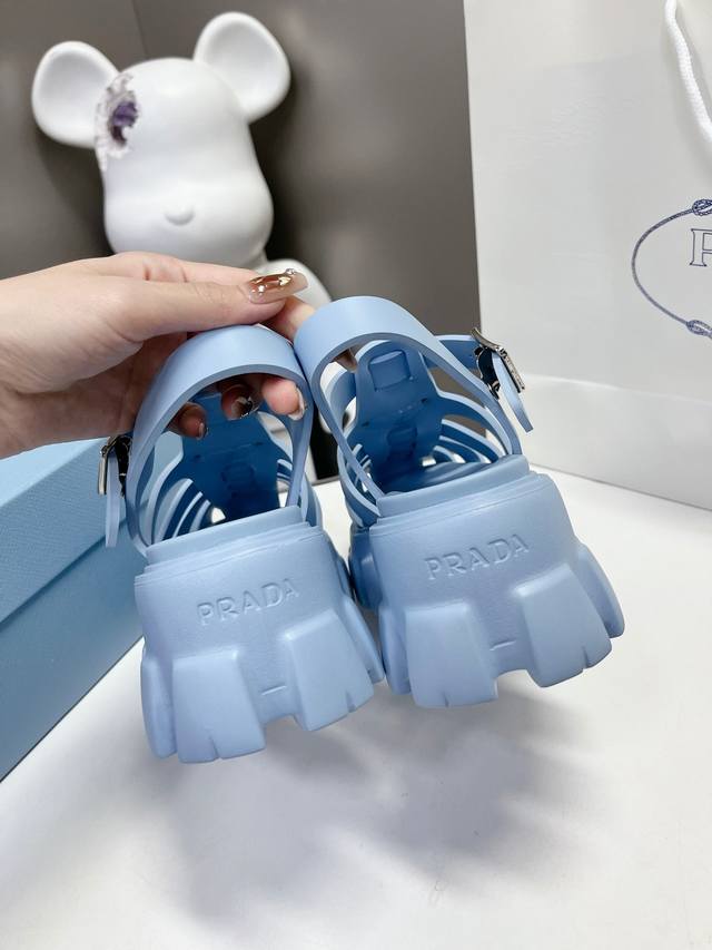 / 超火爆 prada普拉达 最新春夏锯齿罗马编织超轻厚底橡胶凉鞋 E64。复古时髦前卫的轮齿55Mm 厚底鞋底搭配橡胶鞋面,让整双鞋轻便舒适 鲜艳色彩 满足不同风