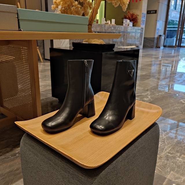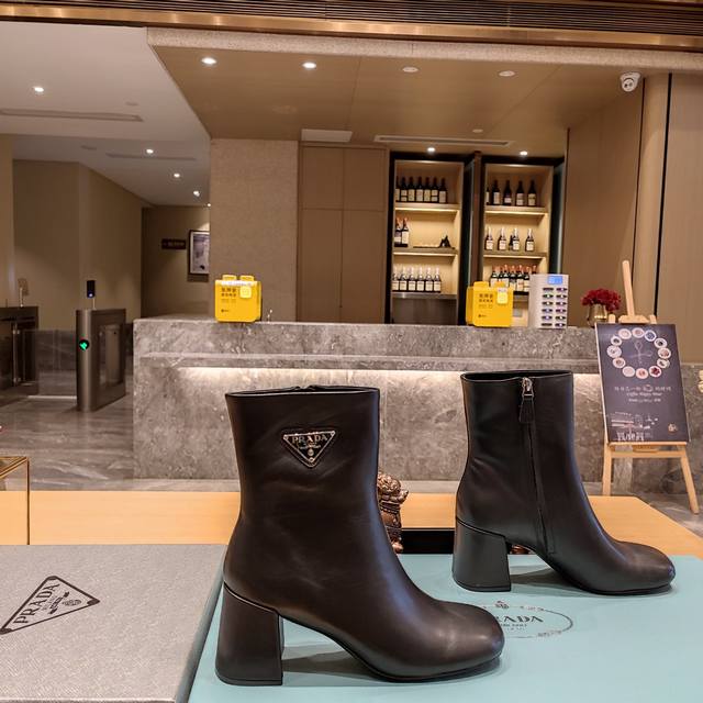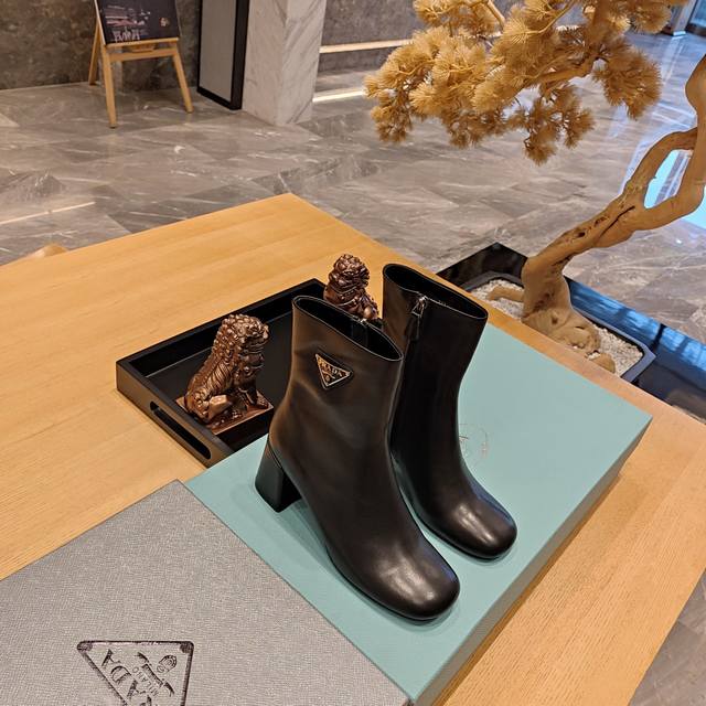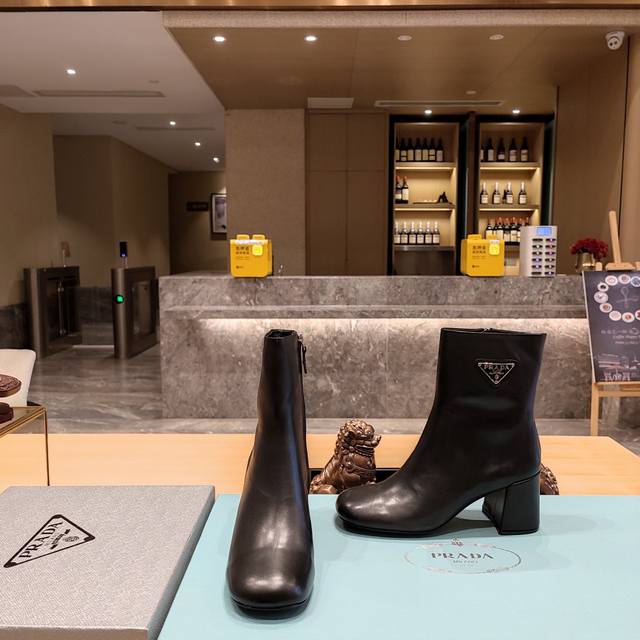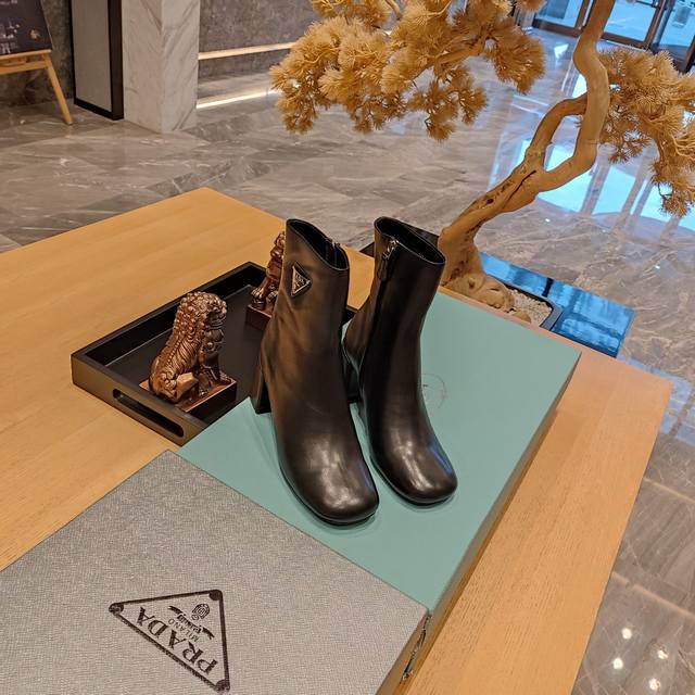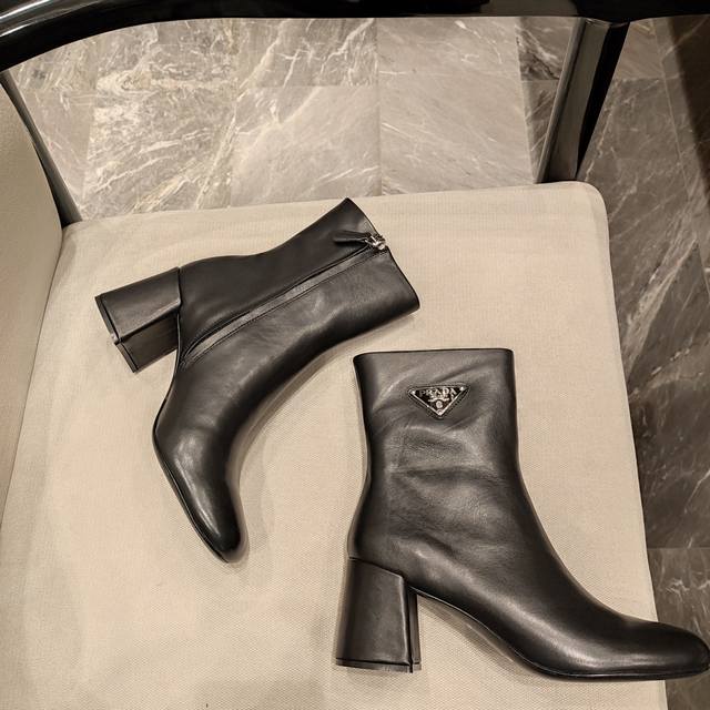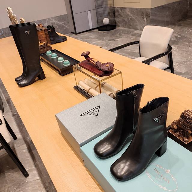 顶级包装配套最高版本 Prada 普拉达新品, 顶级版本 实力来袭!Prada秋冬新款御用的三角标打造 7.5Cm正版圆头粗跟骑士靴 系列:短靴 ,长靴