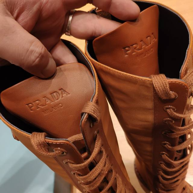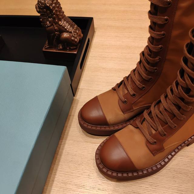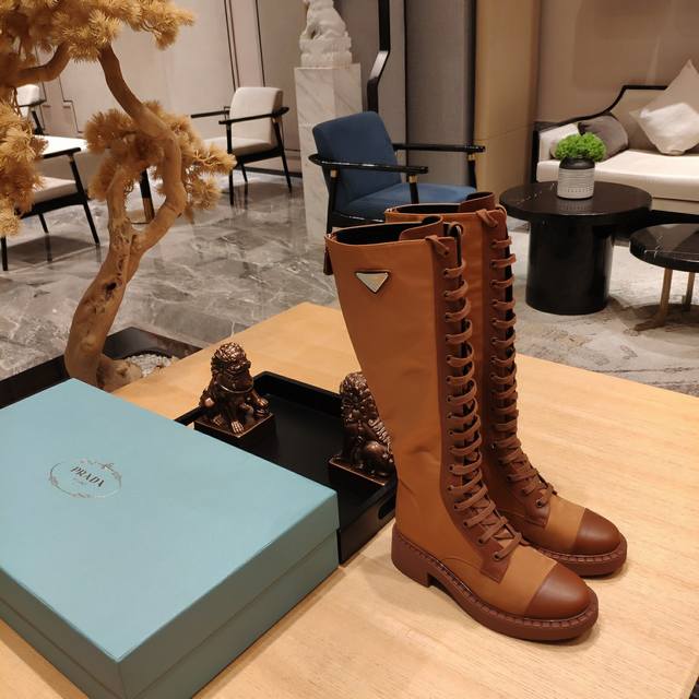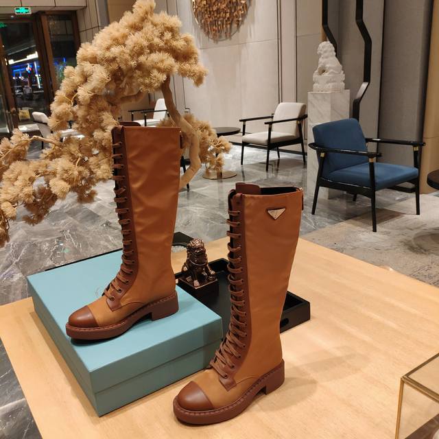 顶级包装配套最高版本 Prada 普拉达秋冬新款瘦腿神器,热门棕黑两色系,绑带马丁靴、骑士靴。 22寸系带长靴