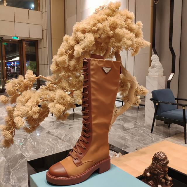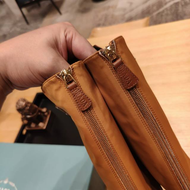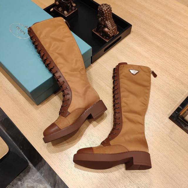 24秋冬最新款长靴,各路名媛网红抢购必收款式,降落伞帆布拼接牛皮靴头。 鞋头立体圆滑,鞋跟粗而不高,脚感非常舒适,软糯无敌,弹力超强,非常博眼球哇!奥力给!秒变大长腿。皮质拉链头压印商标,大底原品logo!官方最新线条,新版成型tpu大底更加柔软轻便,款式延续了普拉达一贯的一脚蹬形状。小粗腿福音,好穿又遮肉。粗瘦腿均可驾驭!
