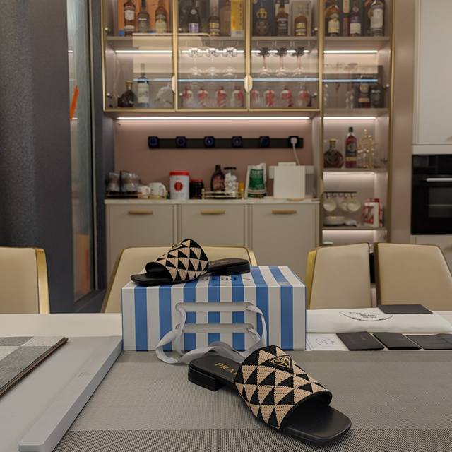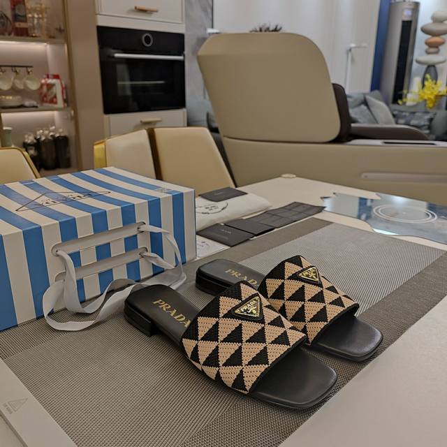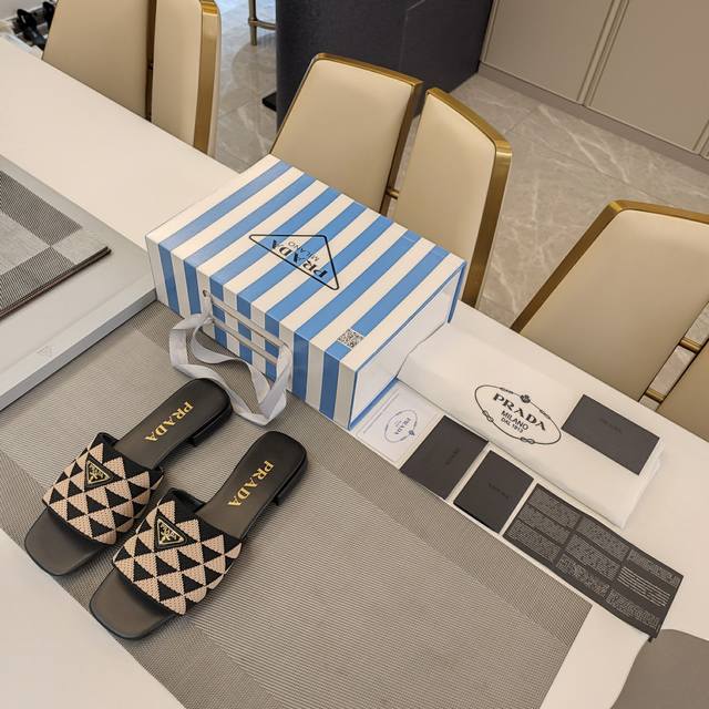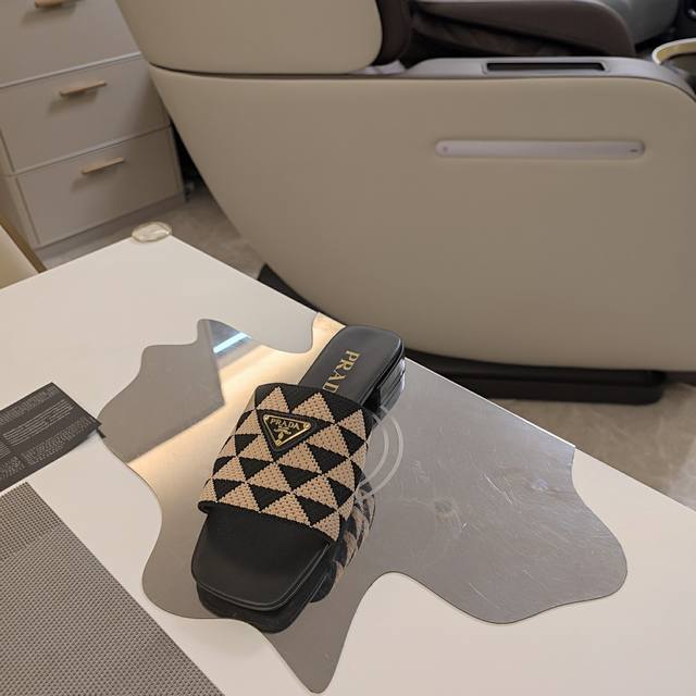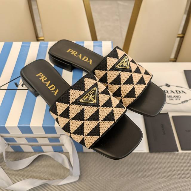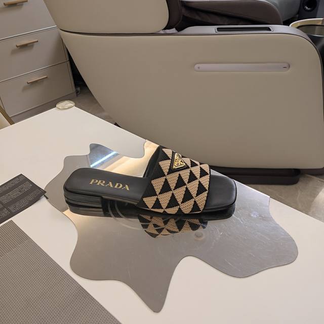 顶级包装配套最高版本 Prada 24普拉达夏秋新品, 顶级版本 实力来袭!Prada Glow限时店新一代平底方头弹力橡筋机织布 3D双色三角鞋面 经典金属扣凉鞋