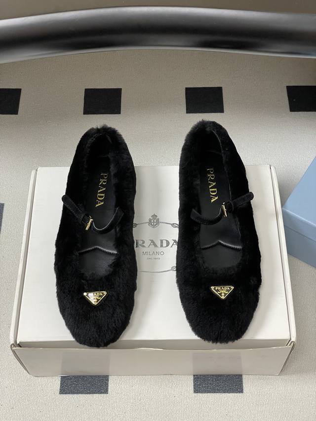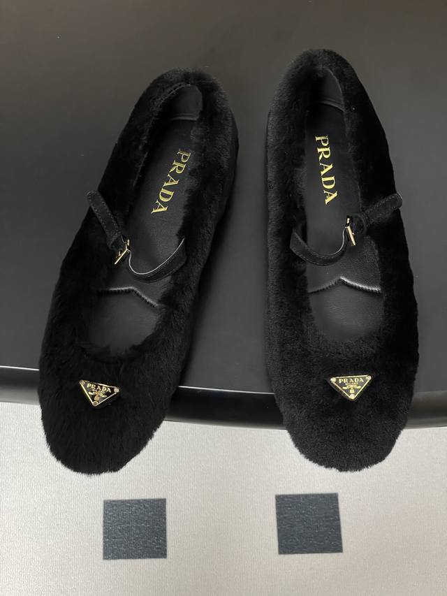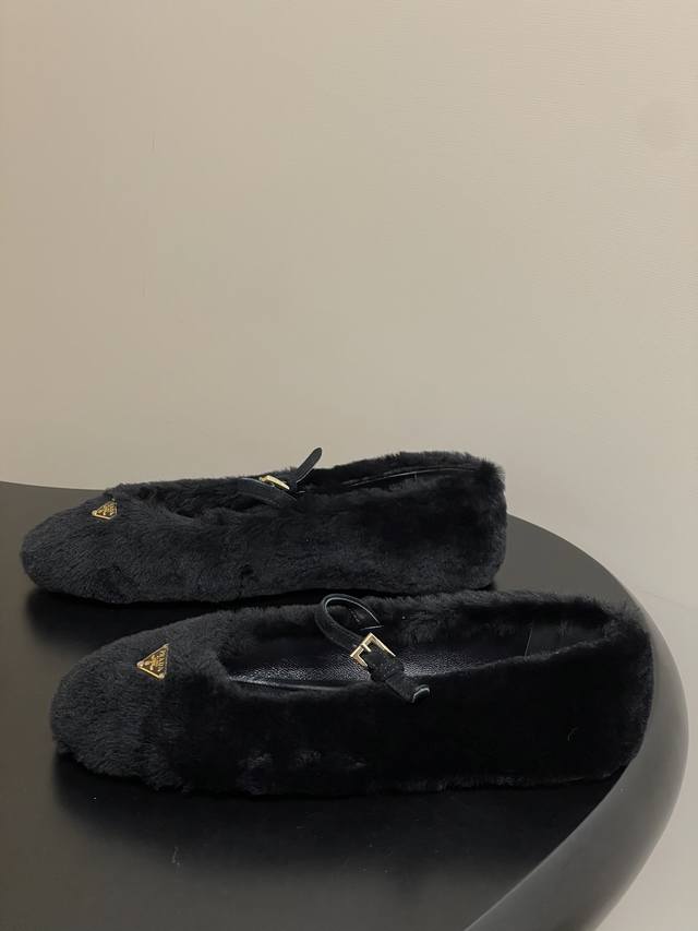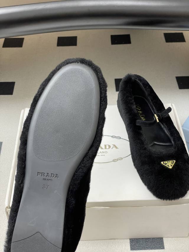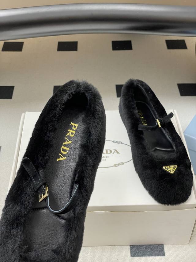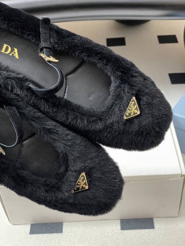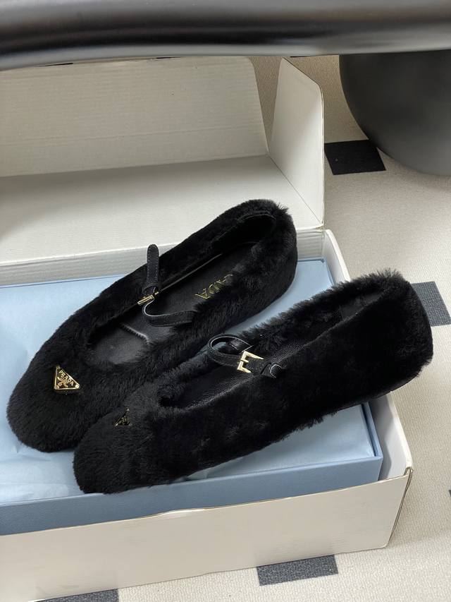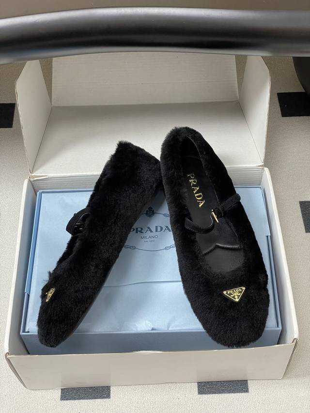 25Ss早秋新款prada普拉达羊毛芭蕾舞平底鞋毛毛玛丽珍芭蕾舞单鞋