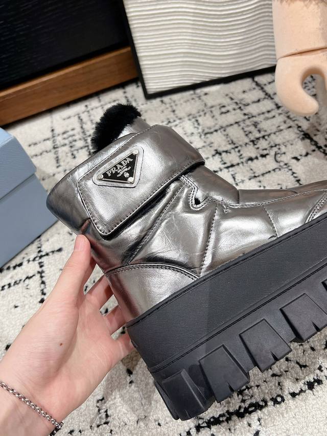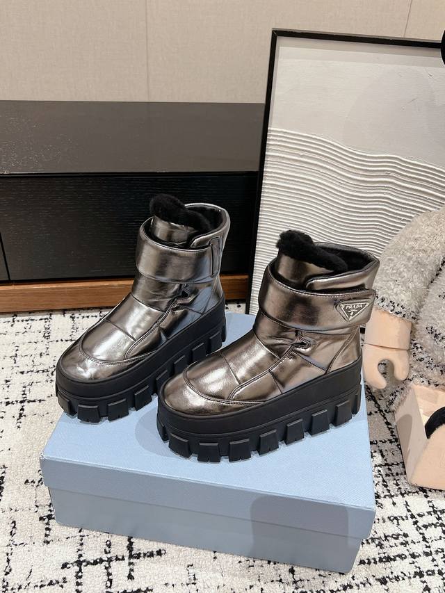 顶级品质 Prada Ss24 New Arrival- 24秋冬新款羊毛雪地靴 进口小牛皮鞋面 魔术贴饰以 三角标加持, 高帮皮毛一体 秋冬氛围感拉满保暖又舒
