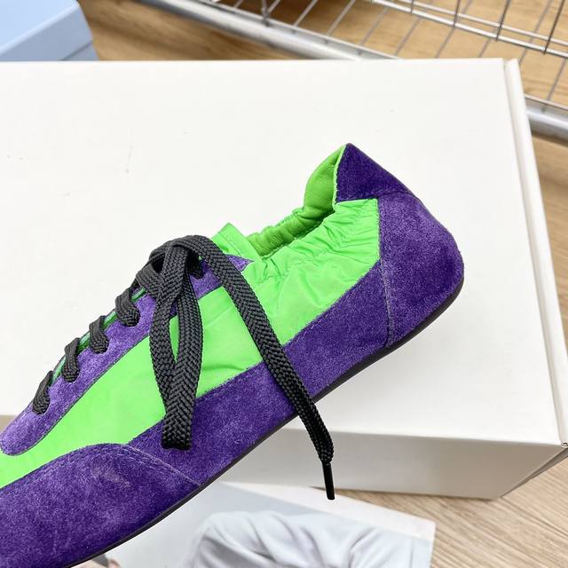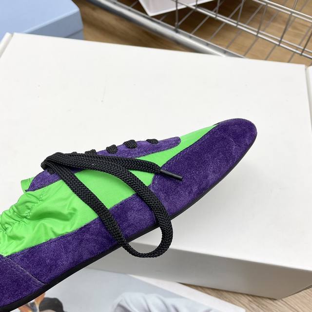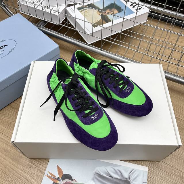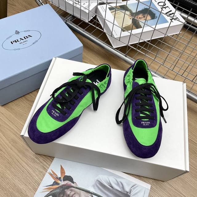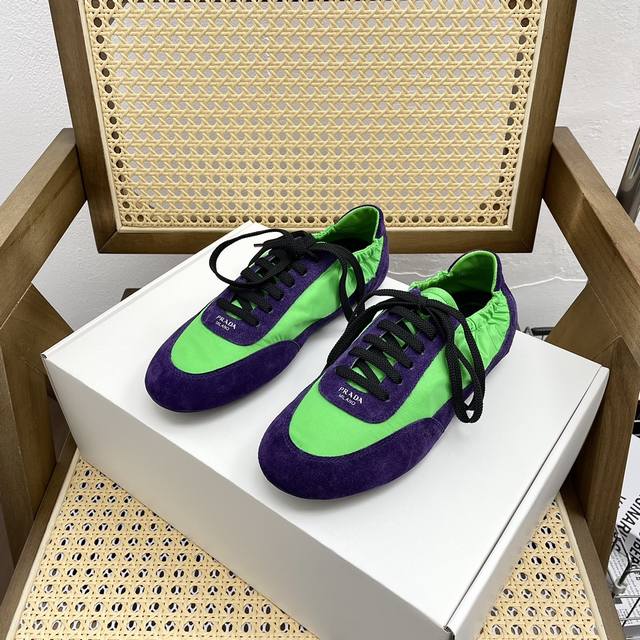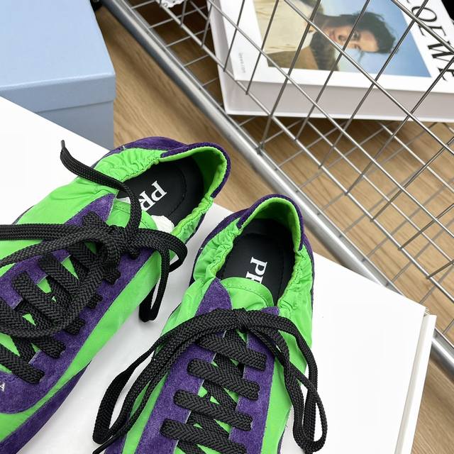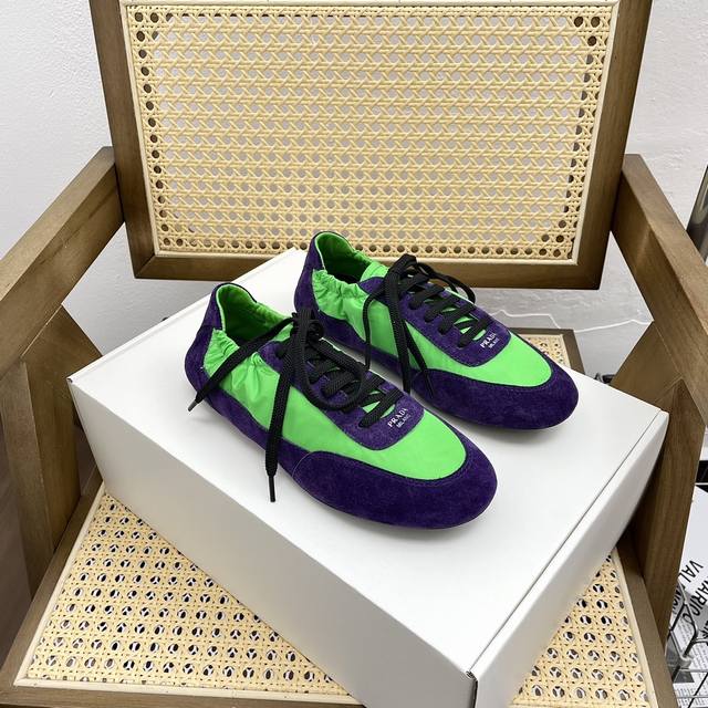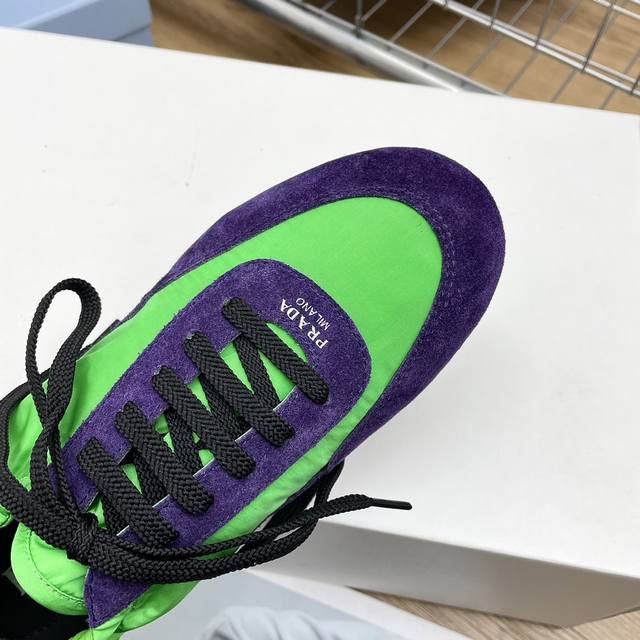 时尚单品薄款休闲鞋 这款至臻轻盈的运动鞋以再生尼龙与绒面皮革打造立体鞋形,混搭材质彰显了prada的运动风尚与精湛工艺灵魂 采用平底设计搭配弹力侧帮,便于穿脱,轻松自如 鞋面饰以丝网印花徽标 橡胶薄底 可拆卸皮面内底鞋面, 轻便好穿实用的一款休闲鞋