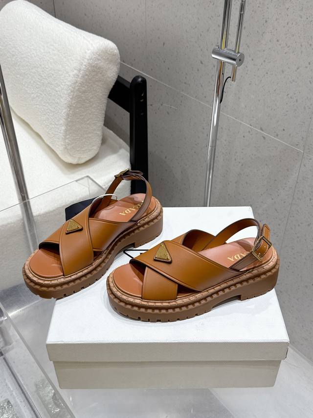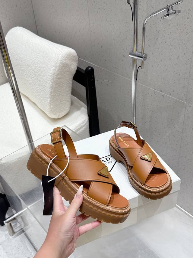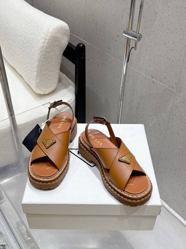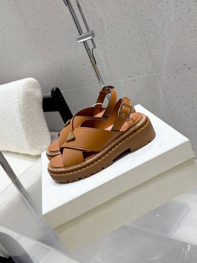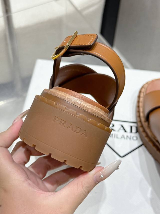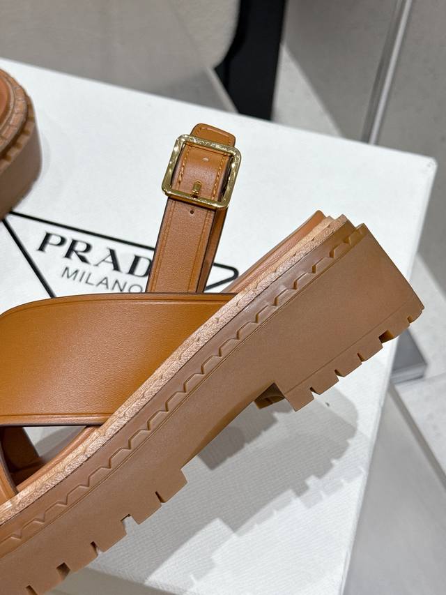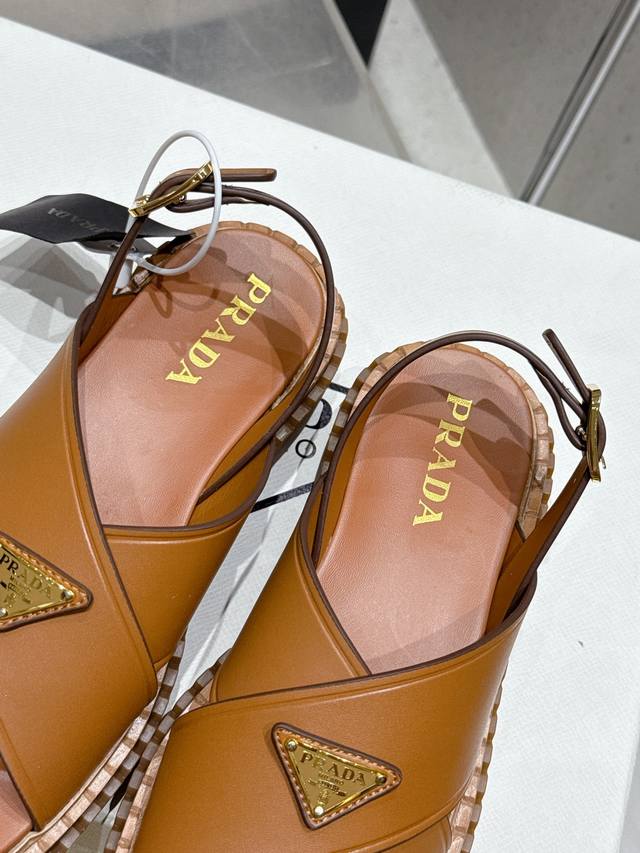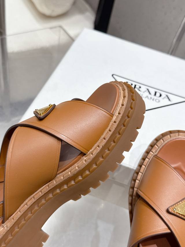 prada普拉达2025最新春夏款厚底 交叉 一字凉鞋Tpu灌注大底让整双鞋轻便舒适 真皮沿边 鲜艳色彩 满足不同风格时髦人士的多种选择!标志性金属三角标