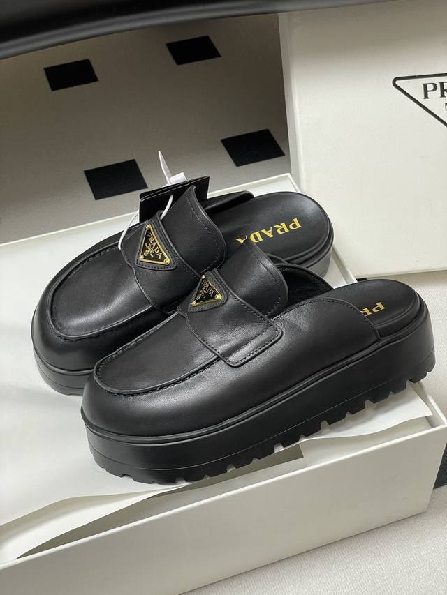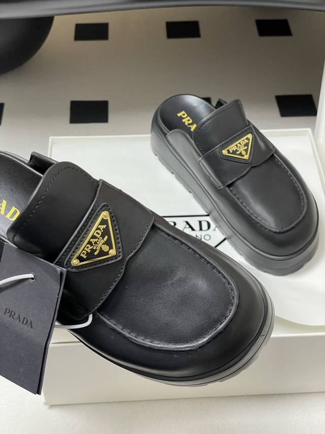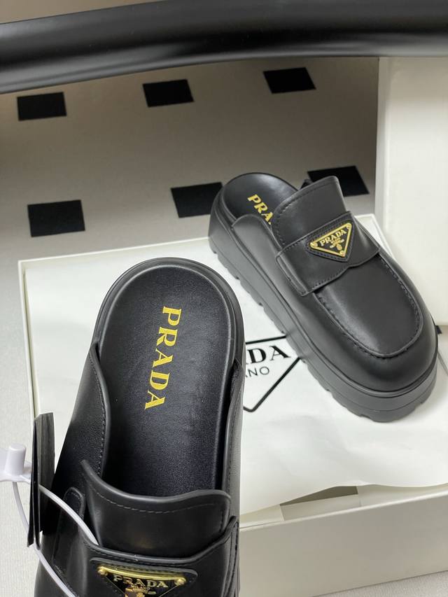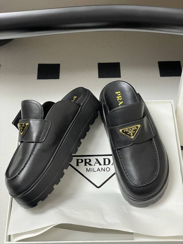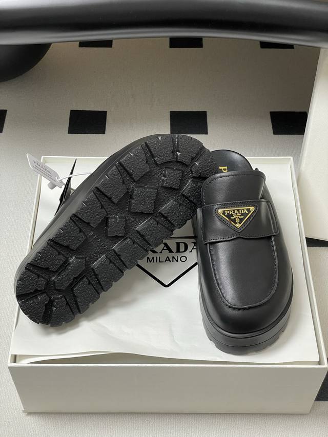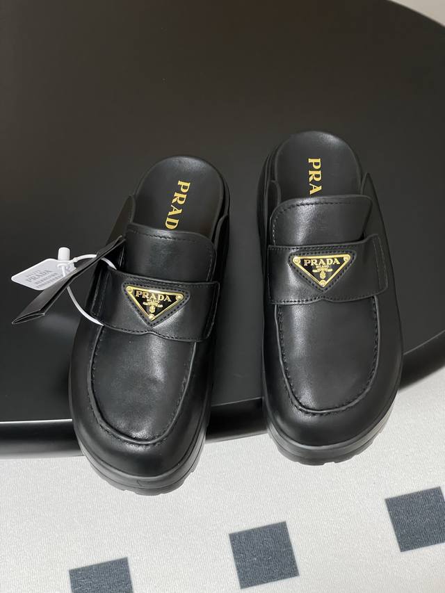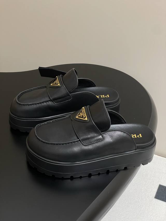 25Ss早春新款prada普拉达三角标一脚蹬厚底勃肯包头半拖穆勒鞋