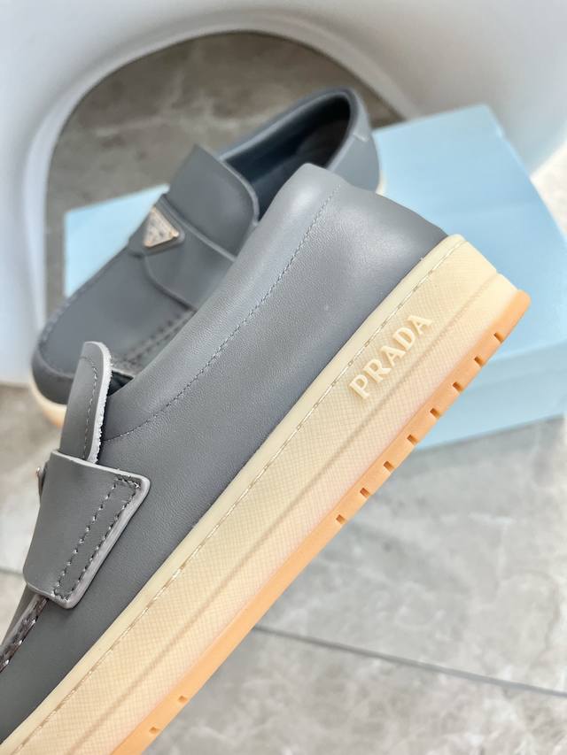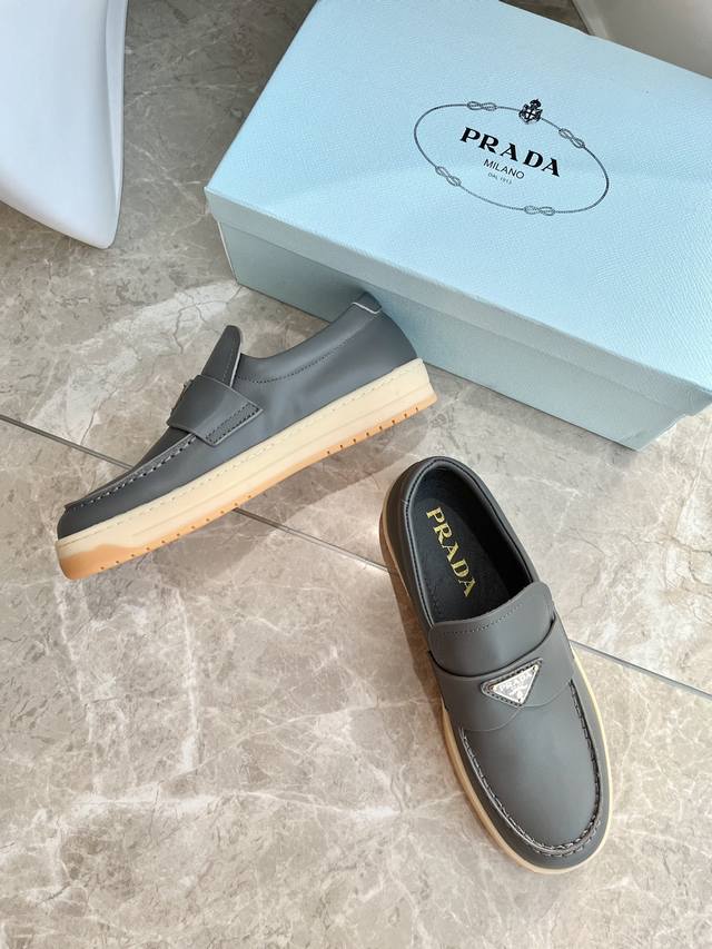 Prada普拉达新款 乐福鞋情侣款 前面倒三角金属logo特有气质 英伦风鞋头不圆不方超好看 一脚蹬超舒服方便 百搭 鞋面牛皮 内里羊皮 码数:35 46