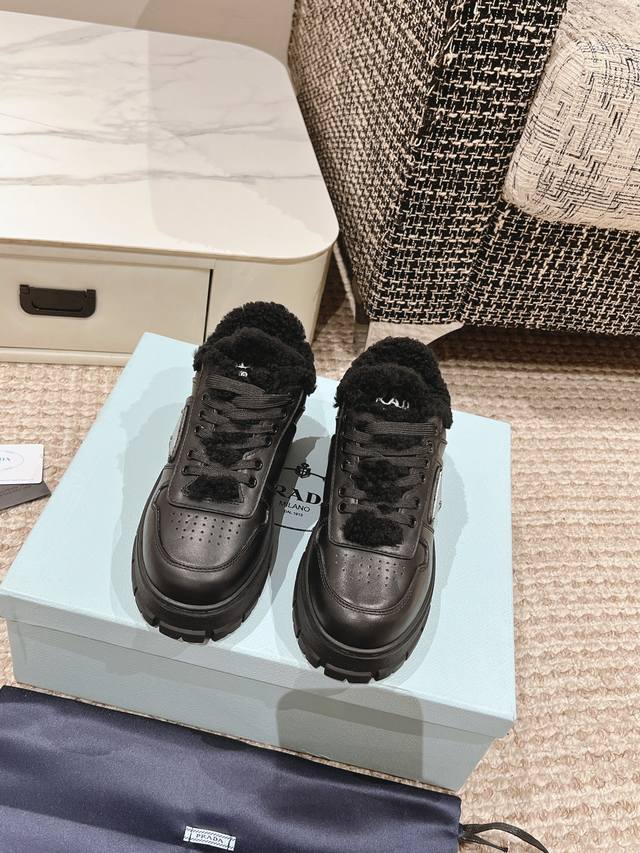 / Prada 普拉达 秋冬羊毛增高运动鞋 甄选进口小牛皮材质,内里皮毛一体羊羔毛,鞋底是高密度发泡鞋底,轻盈舒适,增高效果满分三角标加持,高级感拉满! 码数:35