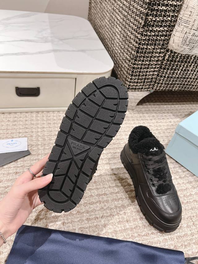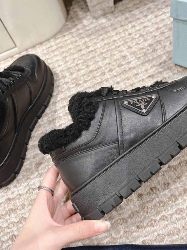 Prada 普拉达 秋冬羊毛增高运动鞋 甄选进口小牛皮材质,内里皮毛一体羊羔毛,鞋底是高密度发泡鞋底,轻盈舒适,增高效果满分三角标加持,高级感拉满! 码数:35