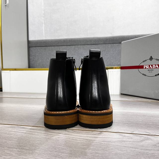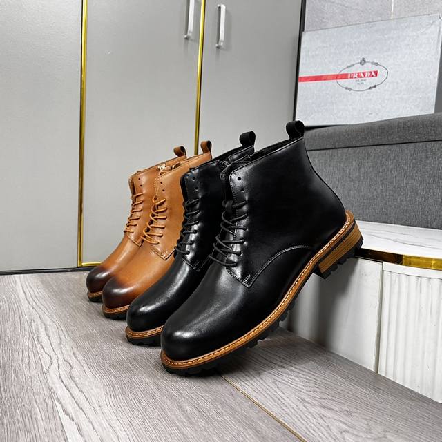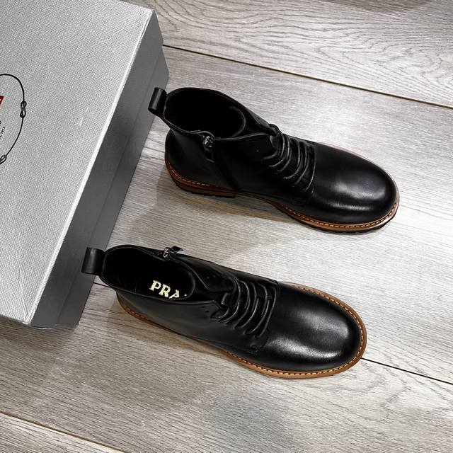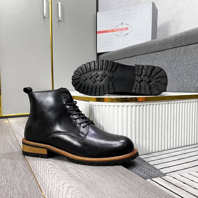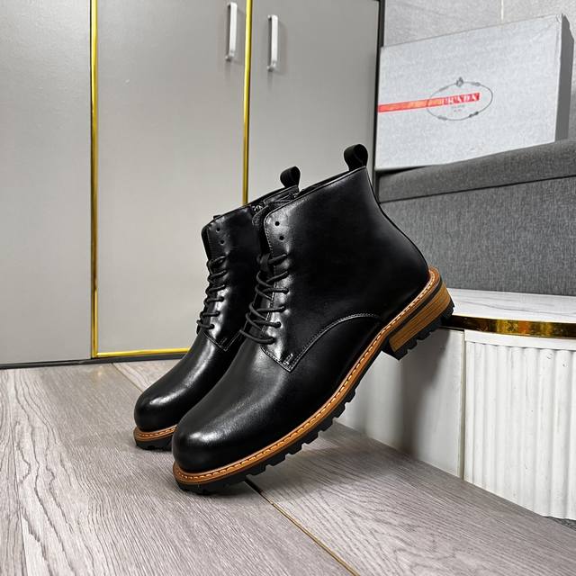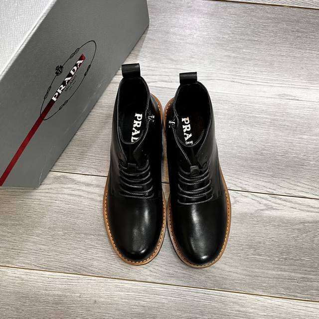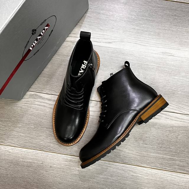 工厂价 P家新品 皮里和羊毛里 Prada 普拉达男士高邦踝靴 套穿式设计短靴 莞产顶级猛货 这款皮靴采用进口牛皮 开边珠亮皮制成...