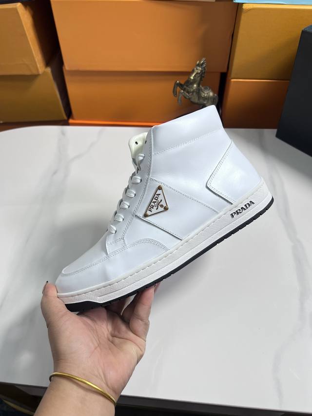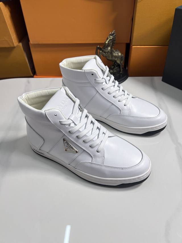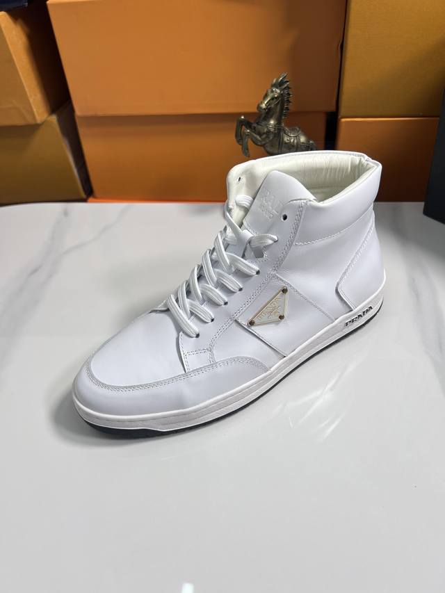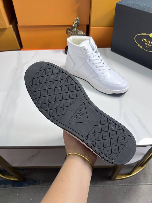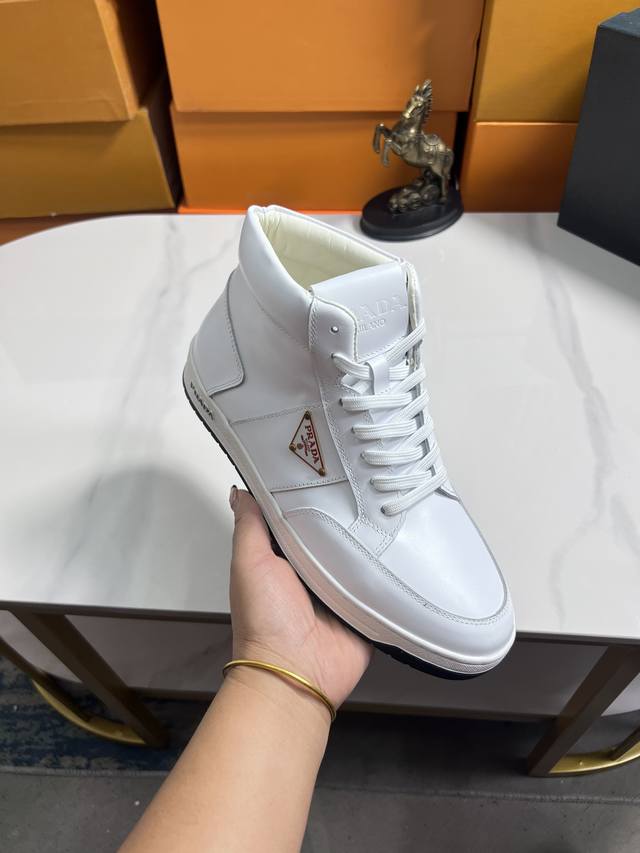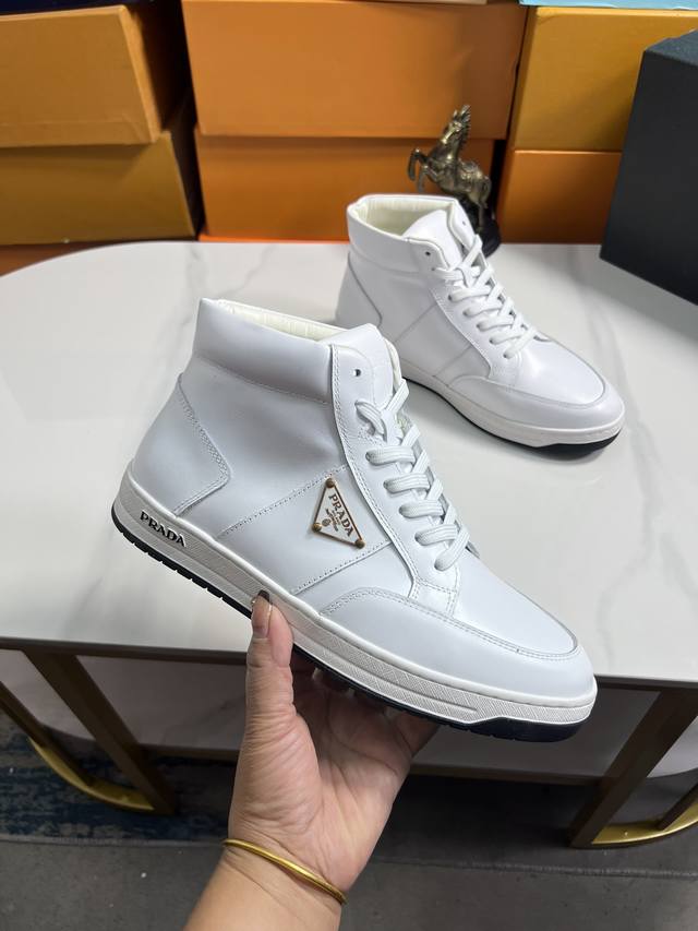 出厂价: 普拉达 高帮休闲板鞋 官网同步新款 进口打蜡牛皮牛皮内里制作原版中底 私家定制滴胶发泡大底大底组合 38-44H