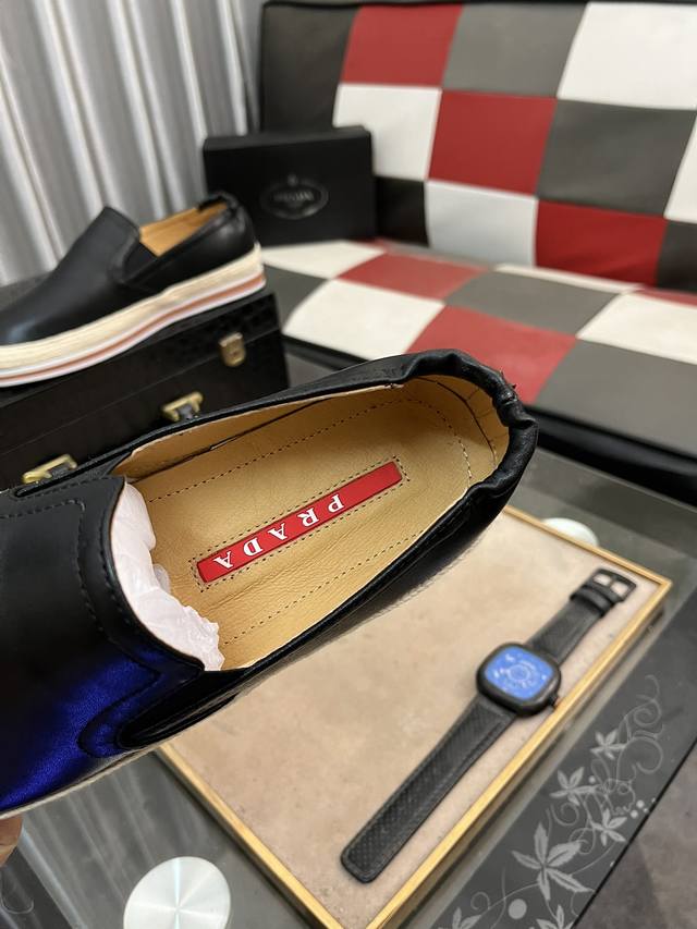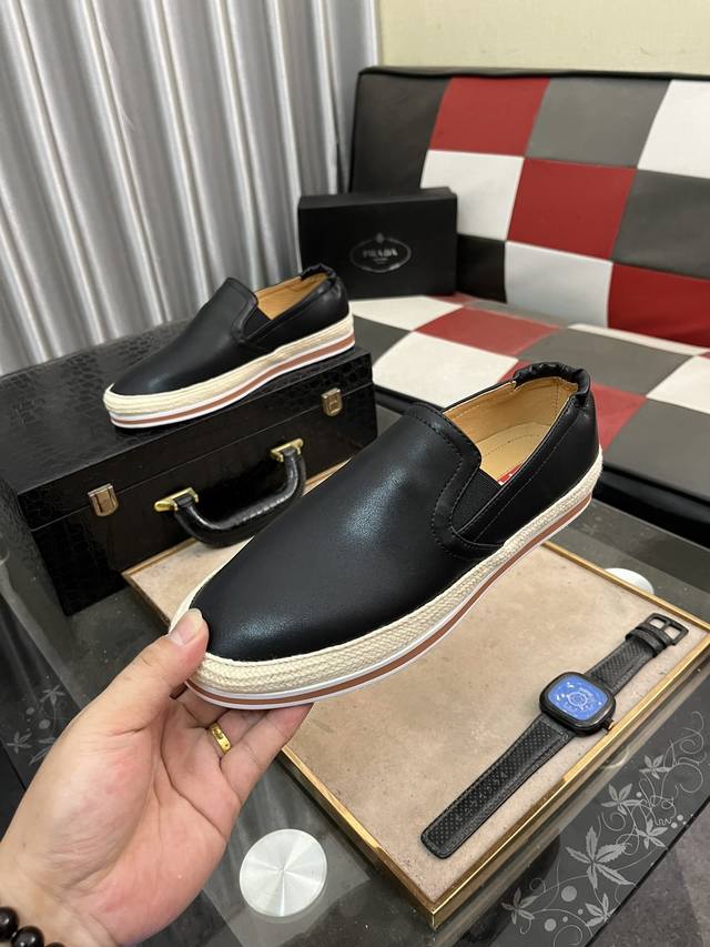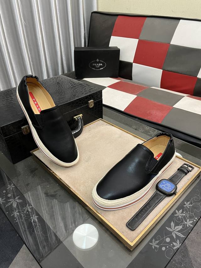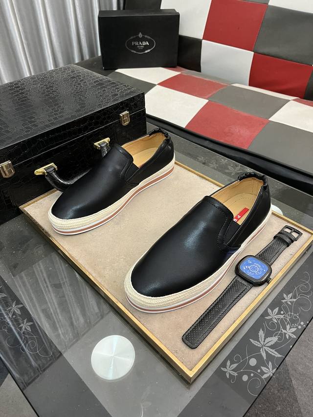 Prada-普拉达 精品系列。鞋面采用头层牛皮,羊皮内里,超轻软弹pu大底。男款38-44 45定做 按平时穿着码数选择即可 。