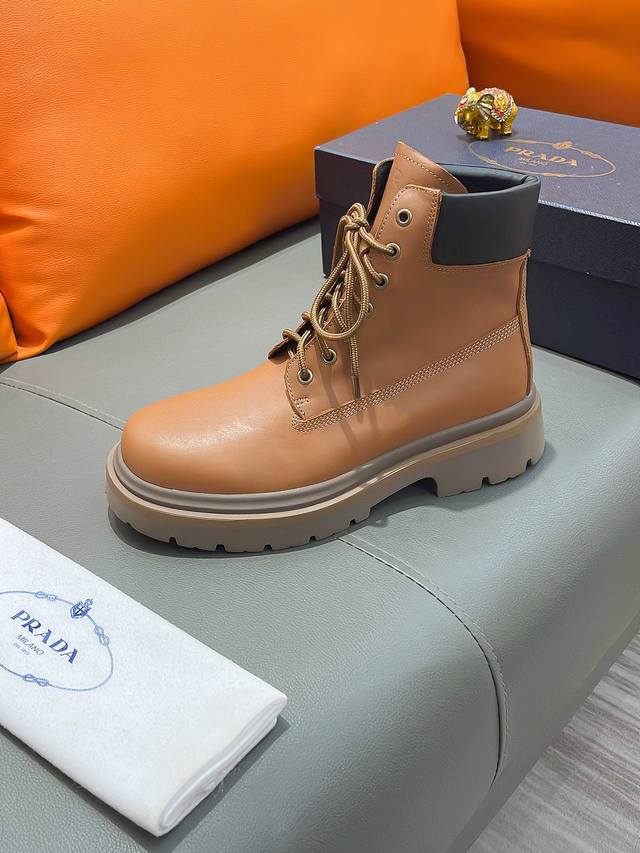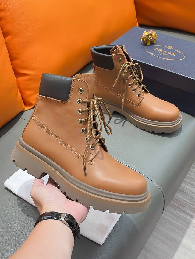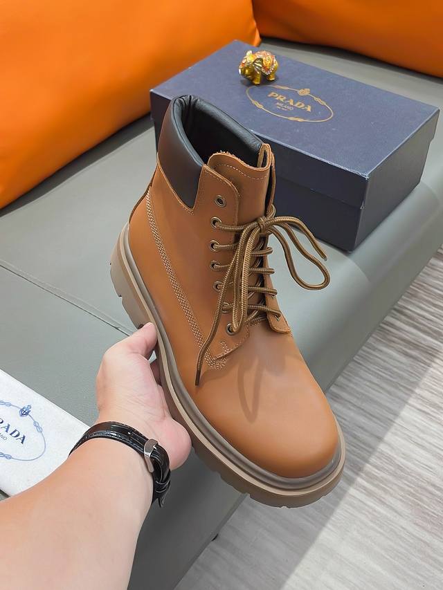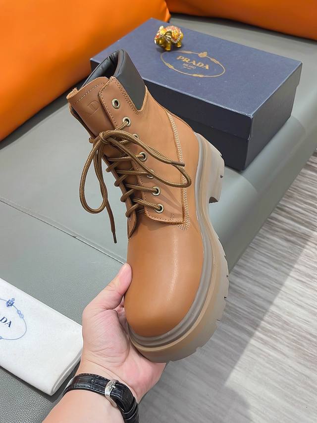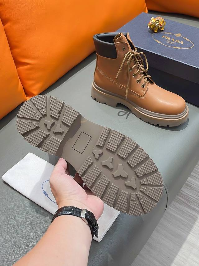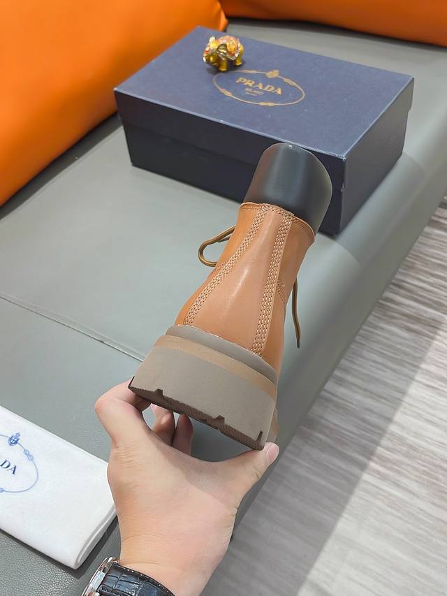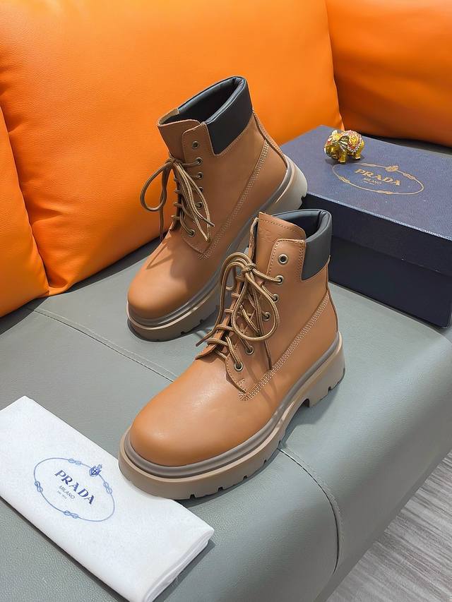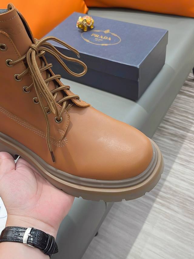 商品名称:PRADA 普拉达 正规码数: 38-44 高帮鞋 商品材料:精选 牛皮鞋面,柔软羊皮垫脚,原厂特供大底。