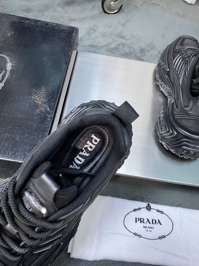商品商标: Prada 普拉达 正码码数: 38-44 商品材料: P家新款厚底运动鞋,银漆工艺多种材料拼接鞋面,搭配柔软透气网布内里 原版防滑耐磨橡胶轻便大底