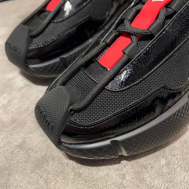 官网1.1 Prada 普拉达男士系带皮革休闲运动鞋,鞋面牛皮拼接透气网面打造 柔软舒适透气 鞋舌装饰prada品牌字母标识 橡胶厚底与红标鞋舌相呼应 款式时尚