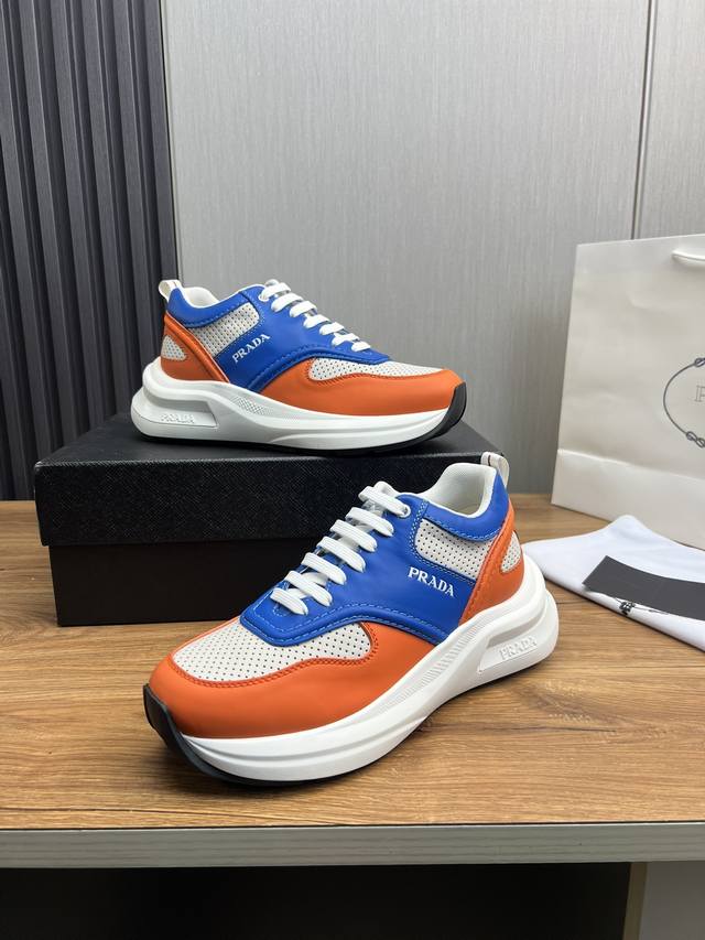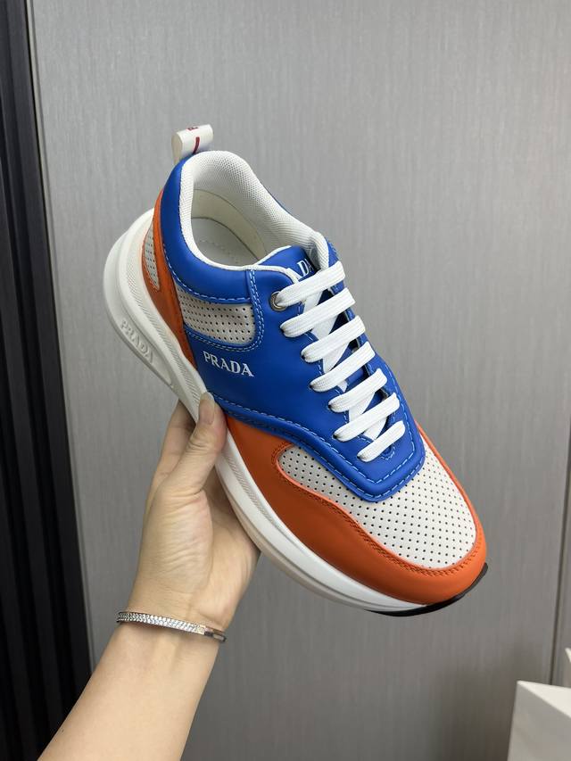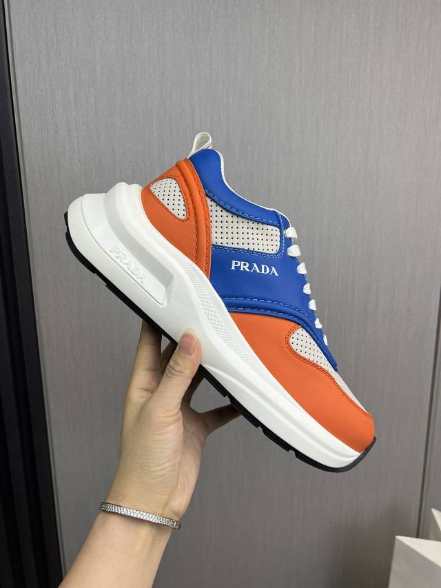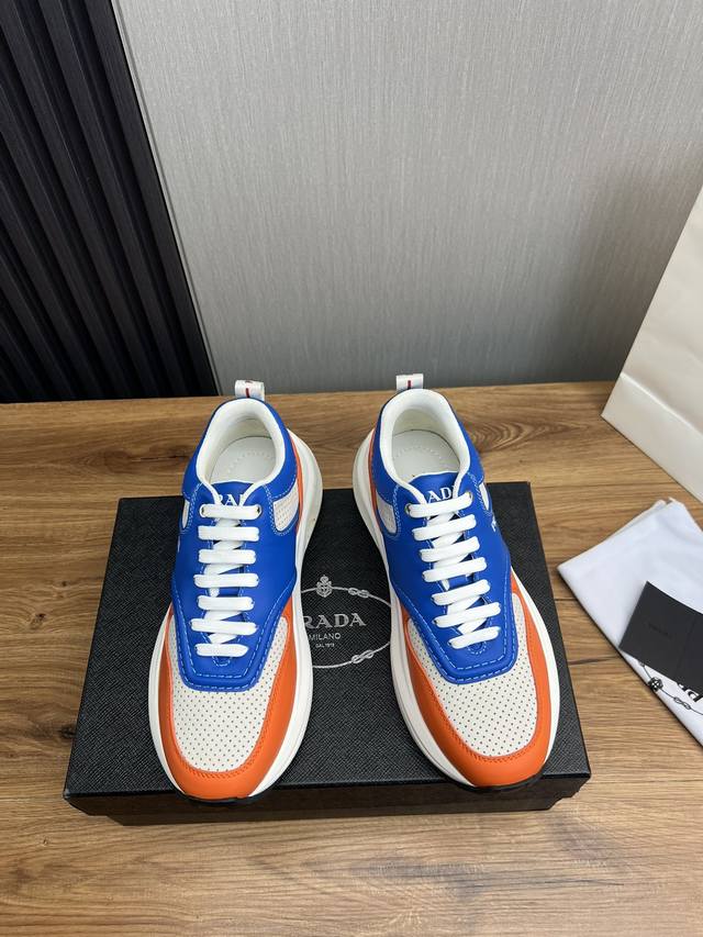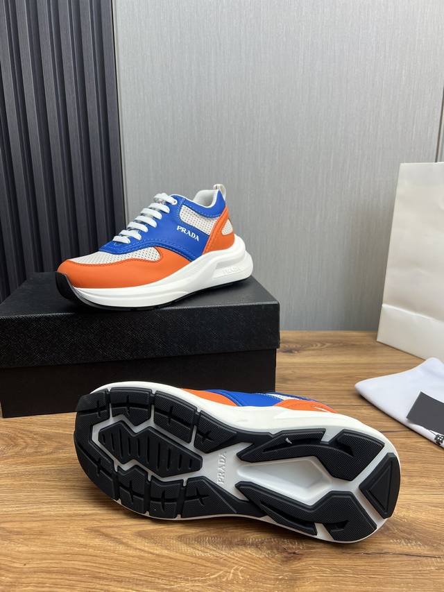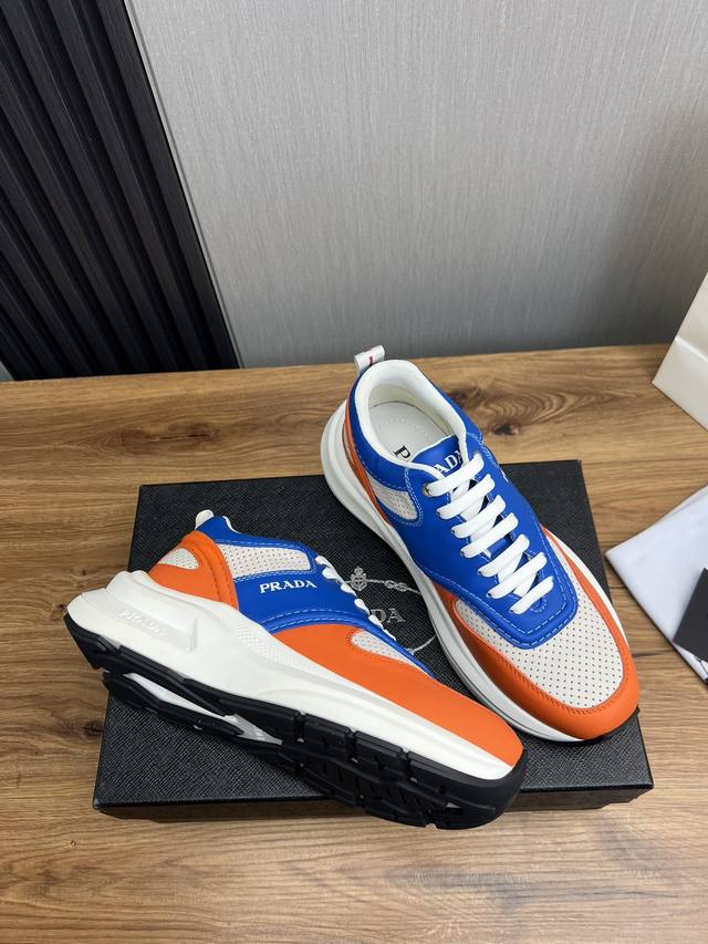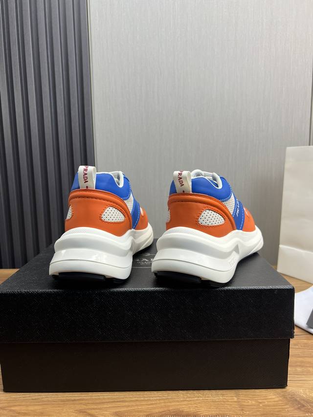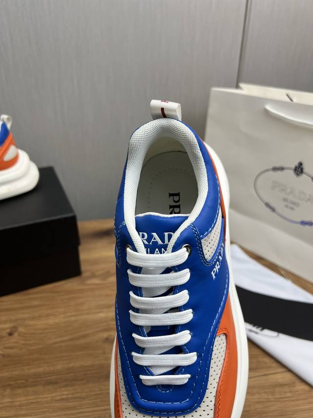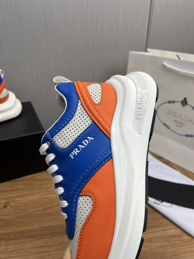 工厂价 Prad* 普拉达 新款男士厚底皮革运动休闲鞋 这款皮革运动鞋采用多材质撞色拼接鞋面,小牛皮+高科技运动网布+对比色牛皮撞色立体圆柱形浮雕饰边,鞋头透气