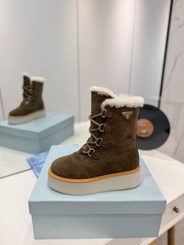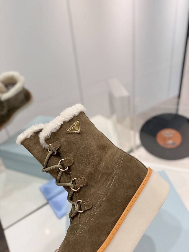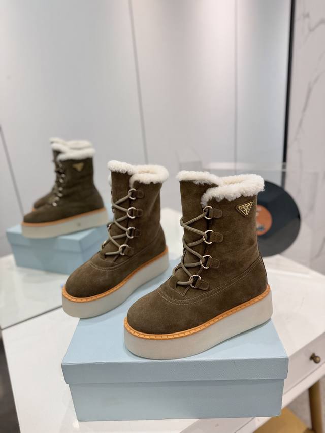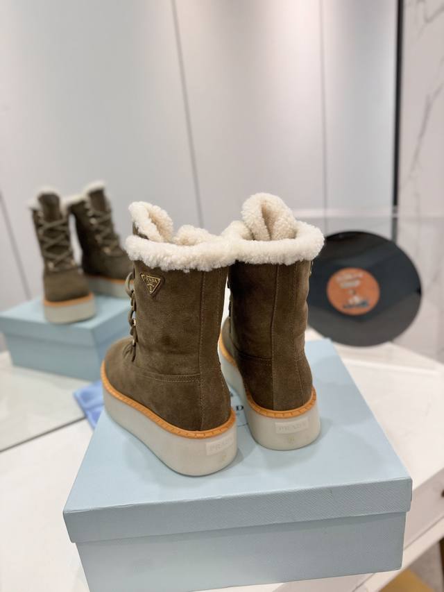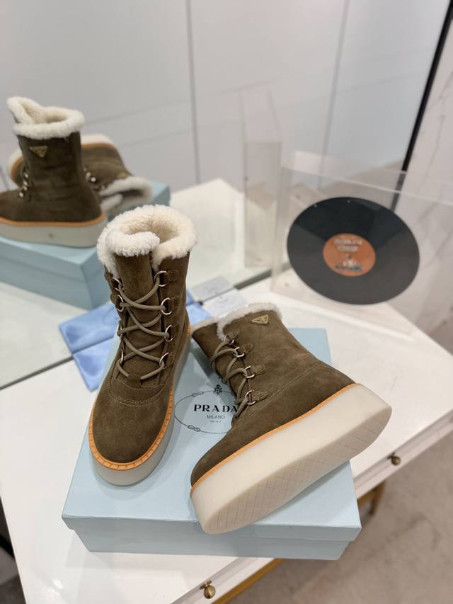 工厂p价 普拉达雪地靴 让整个温暖陪你过冬,经典格纹搭配磨砂皮,经典不失典雅。内里进口A级羊毛里,保暖舒适 鞋面:磨砂皮 内里:百分百真毛 垫脚:真羊毛 鞋底:
