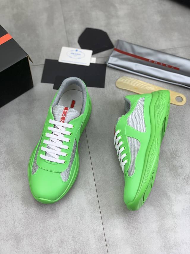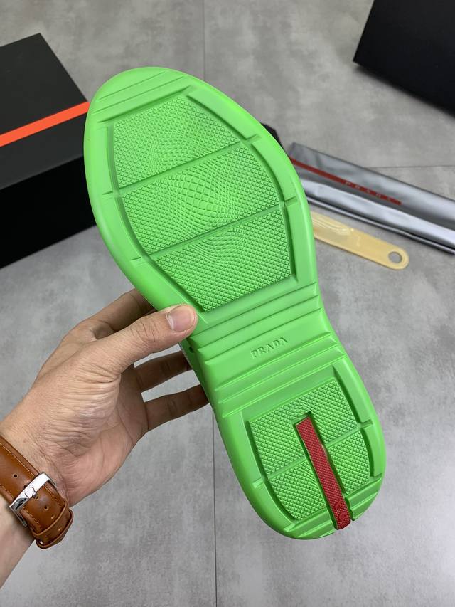 出厂价: Prada 普拉达 鞋面:全粒面纳帕小牛皮+品牌帆布布匹、 内里:水染牛皮 大底:超轻tpr橡胶; 成型大底 码数:38-44 45订做