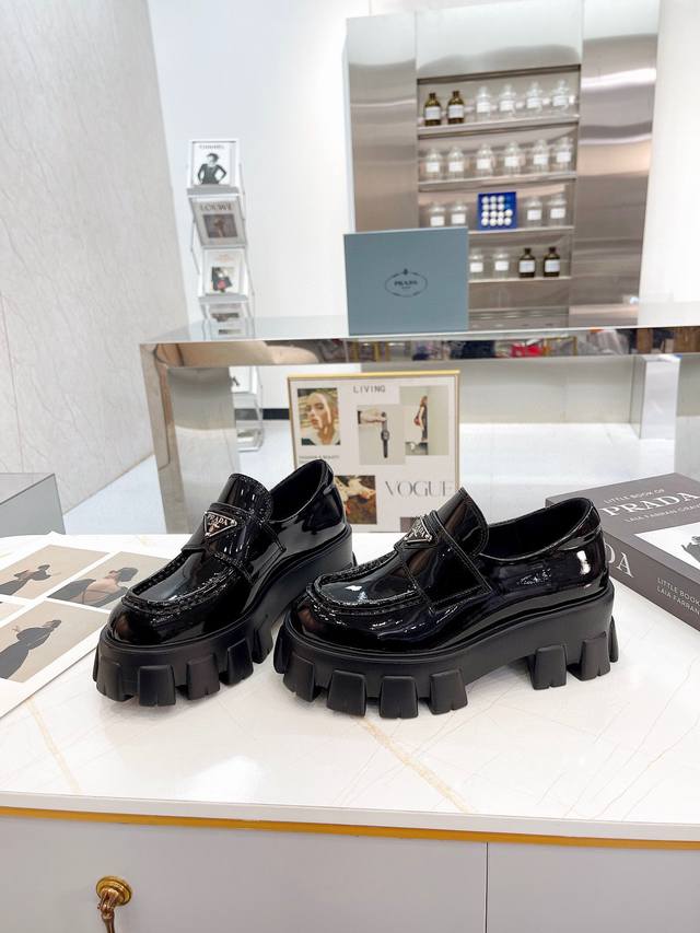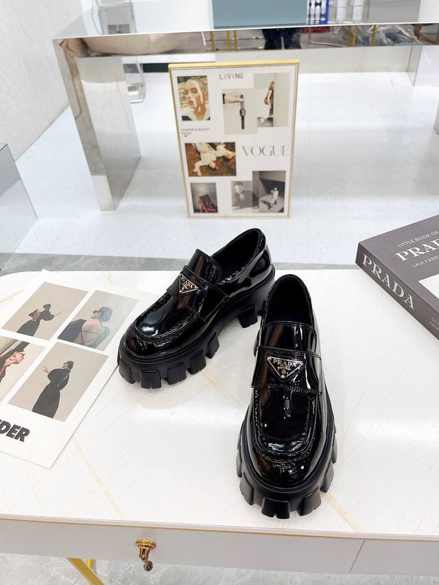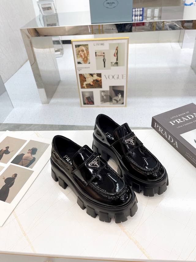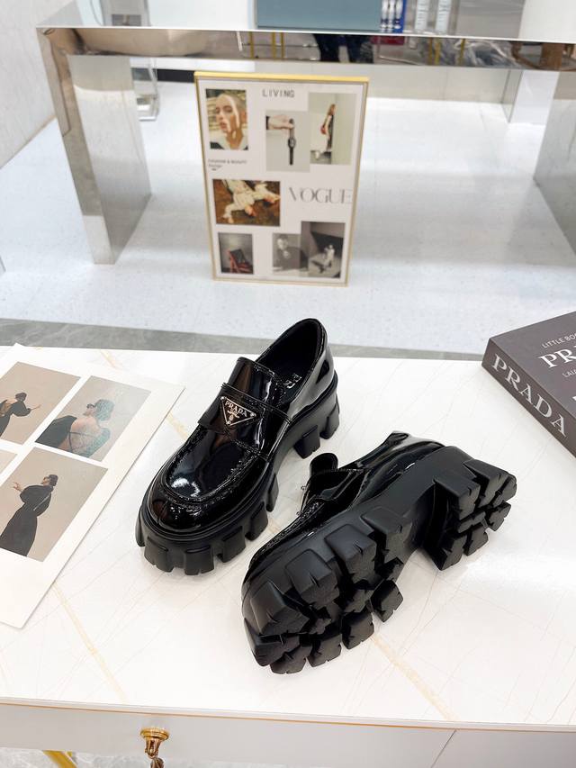 普拉达新款黑色开朱边漆皮底厚休小闲皮鞋,明星同款,prad款这松厚糕底鞋今年常非爆,上穿 高增 闲休两失不误,清的爽表现以足达表对鞋个的子个细节的控把,