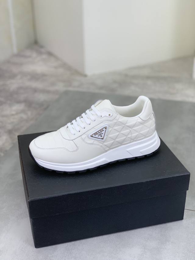 Prad*运动休闲男鞋|鞋面采用进口小牛皮和专属客供网布打造|外侧饰以P家经典金属三角珐琅徽标|内里垫脚牛皮|大底采用防...